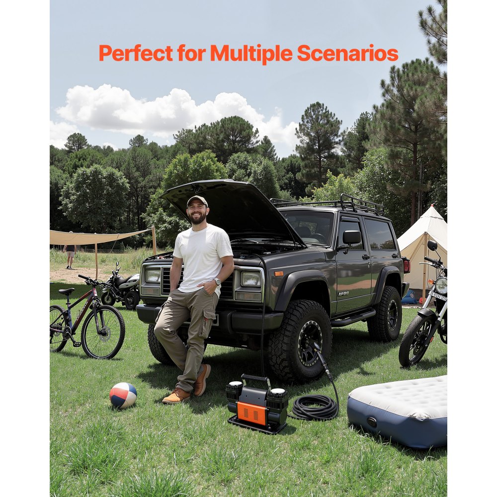 Εξαιρετικά γρήγορο φούσκωμα: Με αναβαθμισμένο σχεδιασμό διπλού κυλίνδρου, υψηλή ροή αέρα 300 L/min και μέγιστη πίεση λειτουργίας 150 PSI, ο αεροσυμπιεστής βαρέως τύπου 12V 1080W φουσκώνει 2 φορές πιο γρήγορα από άλλους, βοηθώντας σας να επιστρέψετε στο δρόμο σε χρόνο μηδέν. Εύκολη λειτουργία: Εξοπλισμένο με ψηφιακό φουσκωτή ελαστικών με μανόμετρο, απλώς πιέστε τη βαλβίδα για να "ανοίξει" για συνεχή πλήρωση, επιτρέποντας αποτελεσματικό φούσκωμα και παρακολούθηση της πίεσης σε πραγματικό χρόνο, χωρίς να χρειάζεται να ενεργοποιείτε/απενεργοποιείτε επανειλημμένα τον διακόπτη του συμπιεστή αέρα. Ευρείες εφαρμογές: Εξοπλισμένο με 3 προσαρμογείς ακροφυσίων και 1 προσαρμογέα κλειδώματος αντίχειρα, αυτό το φορητό φουσκωτό ελαστικών είναι ιδανικό για αυτοκίνητα, SUV, φορτηγά, RV, καθώς και μοτοσικλέτες, ποδήλατα, μπάλες και εξοπλισμό αναψυχής όπως φουσκωτά παιχνίδια και βάρκες. Αξιόπιστη προστασία ασφαλείας: Κατασκευασμένη με σύστημα προστασίας από υπερθέρμανση, αυτή η αντλία αέρα βαρέως τύπου 150 PSI για χρήση εκτός δρόμου αποτρέπει τη ζημιά του κινητήρα από υψηλές θερμοκρασίες, εξασφαλίζοντας ασφαλή λειτουργία και μακροχρόνια απόδοση. Πλήρες πακέτο: Περιλαμβάνει αεροσυμπιεστή διπλού κυλίνδρου βαρέως τύπου με καλώδιο τροφοδοσίας 2 μέτρων + ψηφιακό μανόμετρο με φουσκωτή λάστιχου + λαστιχένιο σωλήνα αέρα 7,8 μέτρων + 3 προσαρμογείς ακροφυσίου + προσαρμογέα κλειδώματος αντίχειρα + φορητή τσάντα εργαλείων. Πάντα έτοιμοι για περιπέτεια εκτός δρόμου.