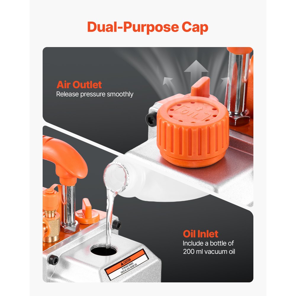 Υψηλής Απόδοσης Σκούπισμα: Αυτή η μονοβάθμια αντλία κενού με περιστροφικά πτερύγια διαθέτει έναν ισχυρό κινητήρα 1/4 HP, που παρέχει ρυθμό ροής 3,5 CFM και μέγιστη σκούπα 5 Pa. Ιδανική για συντήρηση HVAC, εξασφαλίζει βαθύ καθαρισμό και αξιόπιστα αποτελέσματα κάθε φορά. Σταθερή και αξιόπιστη λειτουργία: Εξοπλισμένη με τετραπολικό κινητήρα υψηλής ροπής, αυτή η αντλία κενού HVAC λειτουργεί αποτελεσματικά για μεγάλα χρονικά διαστήματα. Το περίβλημα από χυτοσίδηρο και χυτό αλουμίνιο με ενσωματωμένο ανεμιστήρα ψύξης αποτρέπει την υπερθέρμανση, διατηρώντας σταθερή απόδοση. Εξαιρετική συμβατότητα: Εξοπλισμένη με θύρες εισόδου αέρα SAE 1/4 ίντσας και ACME 1/2 ίντσας, αυτή η αντλία κενού συνδέεται εύκολα σε συστήματα κλιματισμού αυτοκινήτων και σε μικρά συστήματα ψυκτικού R22, R134a και R410a. Φιλικός προς το χρήστη σχεδιασμός: Με χωρητικότητα λαδιού 0,21 qt. (200 ml) και διαφανές παράθυρο λαδιού, ο έλεγχος των επιπέδων λαδιού είναι απλός. Αυτή η αντλία κενού κλιματισμού περιλαμβάνει ακόμη και ένα μπουκάλι λαδιού κενού 0,21 qt. (200 ml), ώστε να μπορείτε να τη χρησιμοποιήσετε αμέσως μόλις την βγάλετε από τη συσκευασία. Ευέλικτες εφαρμογές: Αυτή η αντλία κενού AC για αυτοκίνητα έχει σχεδιαστεί για συντήρηση ψύξης, επισκευή HVAC, απαέρωση ρητίνης και σταθεροποίηση ξύλου. Είναι κατάλληλη τόσο για επαγγελματική όσο και για οικιακή χρήση και χειρίζεται πολλαπλές βιομηχανίες και δημιουργικά έργα.