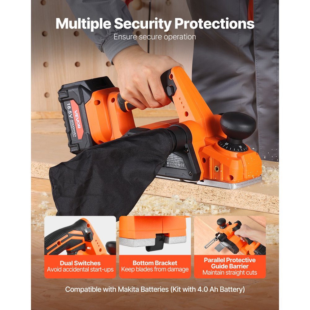 Αποδοτική και ακριβής κοπή: Η ασύρματη πλάνη χειρός διαθέτει ενσωματωμένο κινητήρα 18V χωρίς ψήκτρες με μέγιστο πλάτος πλανίσματος 82 mm και βάθος 2 mm. Μπορεί εύκολα να επιτύχει αποτελεσματική και ακριβή κοπή, εξοικονομώντας χρόνο και προσπάθεια. Ακριβής λοξοτομή: Με ενσωματωμένες αυλακώσεις λοξοτομής, η ηλεκτρική πλάνη χειρός μπορεί εύκολα να ευθυγραμμίσει τις άκρες της σανίδας, επιτυγχάνοντας γρήγορα ένα λείο και επίπεδο αποτέλεσμα λοξοτομής. Πείτε αντίο στις τραχιές, ανώμαλες άκρες. Ρυθμιζόμενο βάθος κοπής: Με ένα κουμπί ρύθμισης, αυτή η ηλεκτρική πλάνη χειρός σάς επιτρέπει να ρυθμίζετε με ακρίβεια το βάθος κοπής για διαφορετικές εργασίες ξυλουργικής. Είτε πρόκειται για λεπτή είτε για βαθιά κοπή, τις χειρίζεται εύκολα, εξασφαλίζοντας παράλληλα ακριβή αποτελέσματα κάθε φορά. Πολλαπλή ασφαλής προστασία: Η ηλεκτρική πλάνη ξύλου διαθέτει σχεδιασμό διπλού διακόπτη για την αποφυγή τυχαίων εκκινήσεων, προσφέροντάς σας ηρεμία κατά την εργασία. Η κάτω βάση της προστατεύει τις λεπίδες από ζημιές, ενώ το παράλληλο φράγμα οδηγού διατηρεί τις κοπές ακριβείς. Μπαταρία μεγάλης χωρητικότητας: Η φορητή πλάνη ξυλουργικής μας διαθέτει μπαταρία υψηλής χωρητικότητας, ώστε να μπορείτε να απολαμβάνετε την ασύρματη άνεση και να εργάζεστε αποτελεσματικά οποιαδήποτε στιγμή, οπουδήποτε. Αντιμετωπίστε απαιτητικές εργασίες σε πολύπλοκα περιβάλλοντα χωρίς περιορισμούς στο καλώδιο τροφοδοσίας.