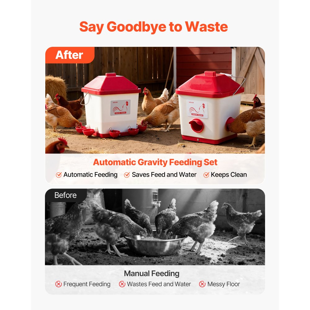 Κιτ Αυτόματης Ταΐστρας & Ποτίσματος: Το σετ αυτόματης ταΐστρας κοτόπουλου μας διαθέτει μια ταΐστρα 40 λίβρες (3 θύρες) και μια ποτίστρα 5 γαλονιών (6 θύρες), και τα δύο κατασκευασμένα από πολυπροπυλένιο. Ο σχεδιασμός τροφοδοσίας με βαρύτητα διατηρεί την τροφή και το νερό φρέσκα και καθαρά, εξοικονομώντας χρόνο και προσπάθεια, ακόμη και σε σύντομες απουσίες. Μεγάλη χωρητικότητα 12 κιλών: Αυτή η αυτόματη ταΐστρα πουλερικών χωράει 12 κιλά τροφής, ταΐζοντας 10-12 ενήλικα κοτόπουλα για 12-17 ημέρες. Διαθέτει τρεις θύρες τροφοδοσίας, εκτεταμένο σχεδιασμό, δακτυλίους στεγανοποίησης και καλύμματα ανθεκτικά στην υγρασία για προστασία από κλοπή και βροχή. Άφθονη παροχή νερού: Η ποτίστρα 5 γαλονιών παρέχει καθαρό πόσιμο νερό για τα πουλερικά. Διαθέτει αυτόματο σύστημα αναπλήρωσης που διατηρεί σταθερή παροχή νερού, μειώνοντας την έκθεση στο νερό και ελαχιστοποιώντας τον κίνδυνο ασθένειας που προκαλείται από μόλυνση. Καθαρότερο κοτέτσι, λιγότερα απόβλητα: Χωρίς χυμένη τροφή και σκόρπισμα νερού! Αυτή η αυτόματη ταΐστρα κοτόπουλου διατηρεί το κοτέτσι σας τακτοποιημένο, μειώνει τη σπατάλη τροφής και νερού και εξοικονομεί χρήματα. Η μυτερή, αδιάβροχη κορυφή αποτρέπει τη συσσώρευση βροχής, διατηρώντας την ταΐστρα και την ποτίστρα στεγνά και καθαρά. Εύκολη χρήση και μετακίνηση: Εξοπλισμένη με μια βολική λαβή για εύκολη μετακίνηση, η αδιάβροχη ταΐστρα κοτόπουλου μας μπορεί να τοποθετηθεί στο έδαφος ή να κρεμαστεί σε τοίχους ή φράχτες. Ιδανική για εσωτερικούς χώρους, μικρά αγροκτήματα και κοτέτσια, επιτρέποντας ευέλικτη και απλή χρήση.