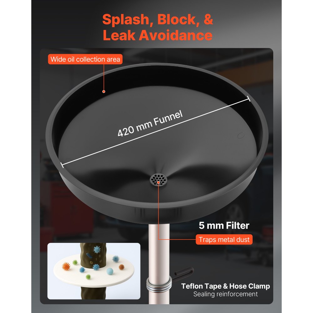 Μεγάλη χωρητικότητα για οικιακή χρήση: Η δεξαμενή αποστράγγισης λαδιού 18 γαλονιών είναι κατάλληλη για πολλαπλές αλλαγές λαδιού, με λειτουργίες βαρύτητας και χειροκίνητης αποστράγγισης για γρήγορο άδειασμα με ελάχιστη ακαταστασία. Ιδανική για συντήρηση αυτοκινήτων, SUV και φορτηγών σε πολυάσχολες, μικρές έως μεσαίες επιχειρήσεις. Ρυθμιζόμενο ύψος: Με εύρος 36-76 ιντσών, αυτή η αποστράγγιση λαδιού προσαρμόζεται σε διάφορα οχήματα, εξασφαλίζοντας στεγανή σύνδεση και αποφεύγοντας διαρροές. Ιδανική για συνεργεία, καταστήματα 4S ή γκαράζ DIY Εύκολη Μετακίνηση: Η τετρακίνηση με περιστρεφόμενους τροχούς 3 ιντσών του φορητού συλλέκτη λαδιού εξασφαλίζει ομαλή μεταφορά σε πολύπλοκα περιβάλλοντα όπως συνεργεία αυτοκινήτων ή προσωπικά γκαράζ Σχεδιασμός με προστασία από διαρροές: Το δοχείο αποστράγγισης λαδιού μας περιλαμβάνει μια χοάνη πλάτους 16,5 ιντσών που δεν διαρρέει, βελτιώνοντας την ανάκτηση λαδιού. Διαθέτει επιπλέον ταινία στεγανοποίησης και σφιγκτήρες για πρόσθετη προστασία από διαρροές, αποφεύγοντας την υπερχείλιση και τις διαρροές. Ανθεκτικό και αξιόπιστο: Η δεξαμενή αλλαγής λαδιού αποστράγγισης PE είναι ανθεκτική στη γήρανση και τη διάβρωση, παρατείνοντας τη διάρκεια ζωής της και μειώνοντας το μακροπρόθεσμο κόστος αντικατάστασης για βαριές εργασίες.