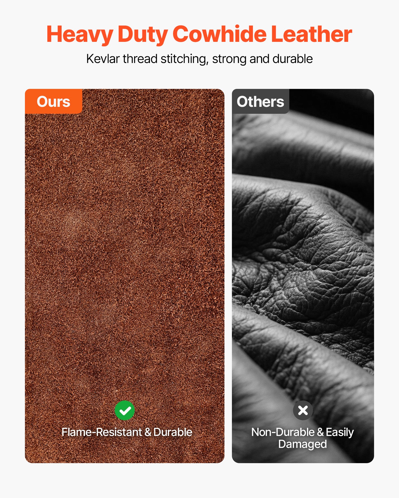 Δέρμα αγελάδας ανθεκτικό στη φλόγα: Κατασκευασμένο από ανθεκτικό, πλήρως δέρμα αγελάδας και ραμμένο με ισχυρό, ανθεκτικό στη φλόγα νήμα Kevlar, το περίβλημα συγκόλλησης VEVOR εξασφαλίζει υψηλή ανθεκτικότητα και αξιόπιστη προστασία, προστατεύοντάς σας από σπινθήρες, φλόγες, θερμότητα και κινδύνους πυρκαγιάς.