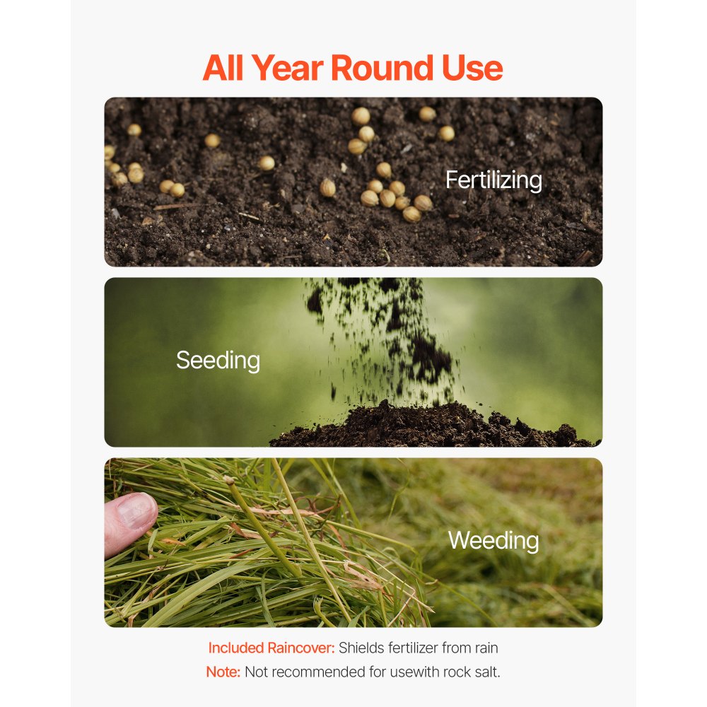 Ακριβής Διασπορά, Όμορφο Γκαζόν: Με πλάτος διασποράς 8 ιντσών και 18 ρυθμιζόμενες ρυθμίσεις, καθώς και έναν ελεγκτή δισκοειδούς σφαιριδίων, αυτός ο διασπορέας ώθησης εξασφαλίζει ακριβή κάλυψη σπόρων, λιπάσματος και λιωμένου πάγου. Οι πολυκατευθυντικές ρυθμίσεις εγγυώνται ομοιόμορφη κατανομή χωρίς χαμένα σημεία. Ανθεκτική κατασκευή: Με ατσάλινο σκελετό με ηλεκτροστατική βαφή και πλαστική χοάνη ανθεκτική στις εκρήξεις, αυτός ο διασκορπιστής ψεκασμών αντιστέκεται στη διάβρωση και τις κρούσεις από την υπεριώδη ακτινοβολία. Εξοπλισμένος με ελαστικά πεπιεσμένου αέρα 8" για χρήση σε όλα τα εδάφη, συμπεριλαμβανομένων χόρτου, χαλικιού και χιονιού. Εύκολη εγκατάσταση: Δεν απαιτούνται εργαλεία για τη συναρμολόγηση. Είναι εύκολο για γυναίκες ή ηλικιωμένους να εγκαταστήσουν τον διανομέα γκαζόν. Η χοάνη μεγάλης χωρητικότητας 60 λιβρών μειώνει τη συχνότητα επαναπλήρωσης, εξοικονομώντας χρόνο και προσπάθεια για μια πιο ευχάριστη εμπειρία κηπουρικής. Ευελιξία όλο το χρόνο: Η προσφορά μας για σπόρους κήπου για ανοιξιάτικη σπορά, καλοκαιρινή λίπανση, αντικατάσταση τεσσάρων εργαλείων με ένα. Κατάλληλο για γκαζόν και μικρά αγροκτήματα. Συμπαγής και πολυλειτουργικός σχεδιασμός: Ο λιπασματοδιανομέας είναι αρκετά μεγάλος για να χωράει γεμάτες σακούλες σπόρων ή λιπάσματος, αλλά συμπαγής για εύκολη αποθήκευση. Παρέχει πλήρη, ομοιόμορφη κάλυψη, αποτρέποντας την υπερβολική ή την ανεπαρκή εφαρμογή.