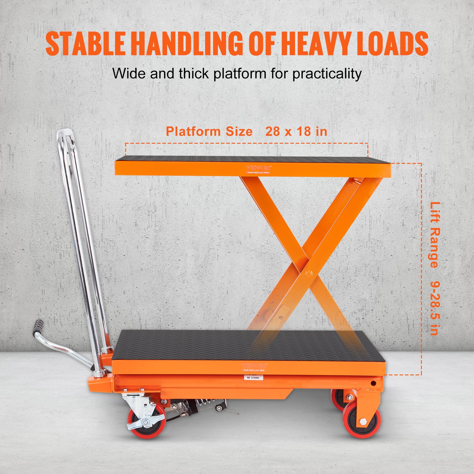 Χωρητικότητα φορτίου 500 λίβρες: Αντιμετωπίστε μια ποικιλία εργασιών ανύψωσης με σιγουριά! Το πορτοκαλί υδραυλικό καροτσάκι μας έχει σχεδιαστεί για να χειρίζεται φορτία έως 500 λίβρες. Το ψαλίδι και η πλατφόρμα είναι κατασκευασμένα από ατσάλι υψηλής πυκνότητας με ανθεκτική στη σκουριά επιφάνεια βαμμένη σε σκόνη. Αυτό εξασφαλίζει μακροχρόνια ανθεκτικότητα και σταθερότητα κατά το χειρισμό βαρέων αντικειμένων, καθιστώντας την εργασία σας εύκολη, αποτελεσματική και ασφαλή.