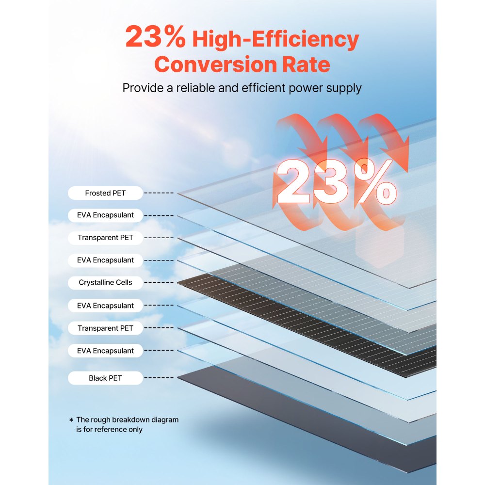 Ανώτερη Απόδοση: Διαθέτοντας μονοκρυσταλλικά στοιχεία υψηλής ποιότητας με απόδοση μετατροπής ≥23%, αυτό το ημι-εύκαμπτο μονο ηλιακό πάνελ 100W μετατρέπει περισσότερο ηλιακό φως σε αξιοποιήσιμη ενέργεια, εξασφαλίζοντας αποτελεσματική παραγωγή ενέργειας για σταθερή ισχύ εξόδου και γρήγορη φόρτιση συσκευών. Ημιεύκαμπτο & Ευέλικτο: Αυτό το ημιεύκαμπτο μονοκρυσταλλικό ηλιακό πάνελ διαθέτει εύκαμπτο σχεδιασμό που ταιριάζει εύκολα σε καμπύλες ή ανώμαλες επιφάνειες, όπως στέγες τροχόσπιτων, σκάφη, στέγες σπιτιών και καμπίνες. Η λεπτή, ελαφριά κατασκευή του διευκολύνει την εγκατάσταση και είναι κατάλληλο για ένα ευρύ φάσμα εφαρμογών εκτός δικτύου. Εύκολη σύνδεση: Σχεδιασμένο με ενσωματωμένο καλώδιο MC4 για γρήγορη και ασφαλή εγκατάσταση, αυτό το εύκαμπτο ηλιακό πάνελ συνδέεται εύκολα στον ελεγκτή και την μπαταρία, εξασφαλίζοντας σταθερή και συνεπή ισχύ εξόδου (Περιλαμβάνεται μόνο ο ηλιακός πίνακας. Ο ελεγκτής, η μπαταρία και το κλιπ αλιγάτορα αγοράζονται ξεχωριστά) Ανθεκτικότητα σε όλες τις καιρικές συνθήκες: Με βαθμό προστασίας IP67 και στιβαρή επιφάνεια από σκληρυμένο γυαλί, ο υψηλής απόδοσης ηλιακός φορτιστής μας εκτός δικτύου λειτουργεί αξιόπιστα από -20°C έως 65°C (-4°F έως 149°F), παρέχοντας μακροχρόνια απόδοση και σταθερή τροφοδοσία σε διάφορα εξωτερικά περιβάλλοντα. Εύκολη εγκατάσταση: Το ημιεύκαμπτο εύκαμπτο ηλιακό πάνελ διαθέτει προ-τρυπημένες οπές στερέωσης για εύκολη εγκατάσταση. Μπορεί να στερεωθεί με δεματικά καλωδίων σε σκηνές, στέγες, αυτοκίνητα, σκάφη ή να κολληθεί σταθερά στην επιφάνεια στήριξης.