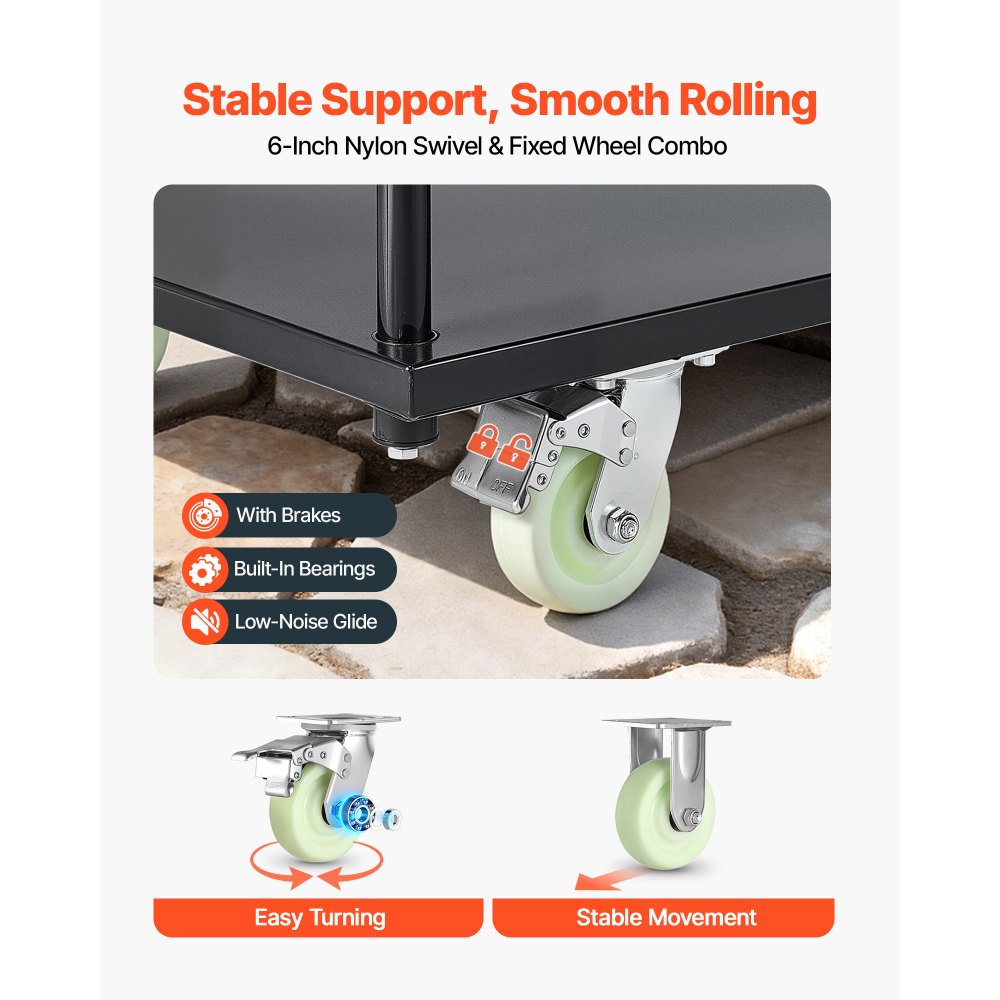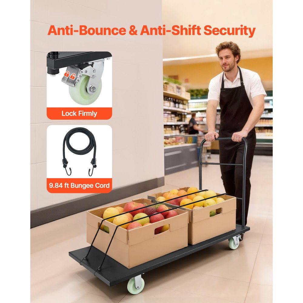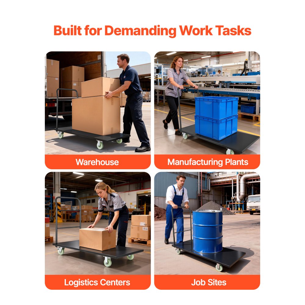 Υψηλή ικανότητα φόρτωσης 900 κιλών: Αυτό το φορτηγό πλατφόρμας βαρέως τύπου διαθέτει κατάστρωμα 60 x 27,6 ιντσών που στέκεται 6,5 ίντσες από το έδαφος. Με στιβαρή κατασκευή, παραμένει σταθερό χωρίς να ταλαντεύεται κάτω από βαριά φορτία, χειριζόμενο έως και 900 κιλά για αποτελεσματική μεταφορά ογκωδών αντικειμένων. Κατασκευή από ανθεκτικό κράμα χάλυβα: Κατασκευασμένο από ανθεκτικό κράμα χάλυβα με φινίρισμα ανθεκτικό στη σκουριά, αυτό το καρότσι με επίπεδη πλατφόρμα αντέχει στη διάβρωση, τις γρατσουνιές και τη μακροχρόνια φθορά. Η ενισχυμένη δομή εξασφαλίζει αξιόπιστη απόδοση για βαριές μεταφορές. Αποσπώμενη και φιλική προς το χρήστη λαβή: Σχεδιασμένη για ευελιξία, αυτή η βιομηχανική χειροκίνητη λαβή περιλαμβάνει λαβή διαμέτρου 1,26 ιντσών που επιτρέπει γρήγορη εγκατάσταση και συμπαγή αποθήκευση. Αποσπάστε την για εξοικονόμηση χώρου ή επανατοποθετήστε την για αποτελεσματικές καθημερινές εργασίες μεταφοράς. Νάιλον τροχοί, ομαλή κύλιση: Εξοπλισμένο με τέσσερις νάιλον τροχούς 5 ιντσών - δύο περιστρεφόμενους τροχούς με φρένα ποδιών και δύο σταθερούς τροχούς. Αυτό το καρότσι πλατφόρμας προσφέρει κινητικότητα 360° και λειτουργία χαμηλού θορύβου, με φρένα που παρέχουν σταθερό παρκάρισμα. Ευρεία Βιομηχανική & Εμπορική Χρήση: Αυτό το καρότσι με επίπεδη καρότσα με ρόδες είναι ιδανικό για αποθήκες, εργαστήρια, μάντρες εμπορευμάτων και άλλους βιομηχανικούς ή εμπορικούς χώρους. Μετακινεί εύκολα βαριά φορτία και βοηθά στη βελτίωση της συνολικής αποδοτικότητας της ροής εργασίας.