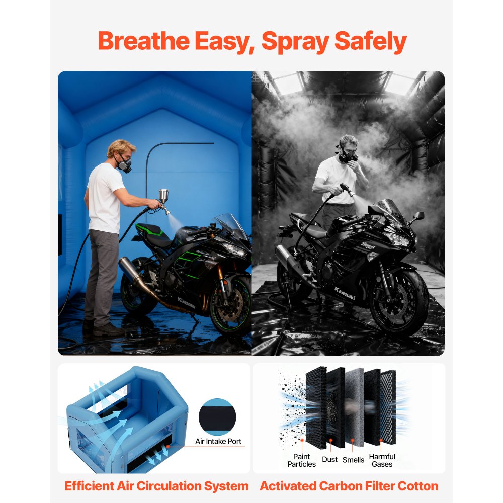 Καθαρός Χώρος Εργασίας: Το σύστημα θετικής πίεσης υψηλής απόδοσης με διπλά φίλτρα μπλοκάρει τη σκόνη και τους ατμούς, μειώνοντας παράλληλα τις οσμές χρώματος και τα επιβλαβή αέρια. Ο φουσκωτός θάλαμος βαφής μας παρέχει έναν καθαρό και άνετο χώρο εργασίας για εσάς και την οικογένειά σας. Κατασκευασμένο για να διαρκεί: Ο φουσκωτός θάλαμος ψεκασμού μας είναι κατασκευασμένος από ύφασμα Oxford 210D υψηλής ποιότητας με ενισχυμένες διπλές ραφές, ανθεκτικός στο σκίσιμο και τη φθορά, ενισχύοντας τη δομική αντοχή και την αεροστεγανότητα για μακροχρόνια χρήση σε εξωτερικούς ή επαγγελματικούς χώρους. Εύκολη εγκατάσταση και αποθήκευση: Ο θάλαμος βαφής με φυσητό φουσκώνει σε 30 δευτερόλεπτα και μπορεί να συναρμολογηθεί από ένα άτομο. Ξεφουσκώνει σε μικρό μέγεθος και χωράει σε μια φορητή τσάντα μεταφοράς, καθιστώντας τη μεταφορά και την αποθήκευση αβίαστη για όλα τα έργα σας. Αναβαθμισμένος σχεδιασμός: Η κεκλιμένη κορυφή του φουσκωτού θαλάμου ψεκασμού χρώματος μειώνει τη συσσώρευση νερού. Το κομψό νέο εξωτερικό φαίνεται υπέροχο και βελτιώνει τη σταθερότητα στον αέρα για αποτελεσματική βαφή. Συμβουλές Χρήσης: Αποφύγετε τη χρήση του φορητού φουσκωτού θαλάμου βαφής σε βροχή, χιόνι ή ισχυρούς ανέμους. Βεβαιωθείτε ότι υπάρχει επαρκής αερισμός σε εσωτερικούς χώρους. Οι διαρροές ραφών αποτρέπουν το υπερβολικό φούσκωμα για σταθερή ροή αέρα. Διατηρήστε τον φυσητήρα σε λειτουργία κατά τη διάρκεια του φουσκώματος.