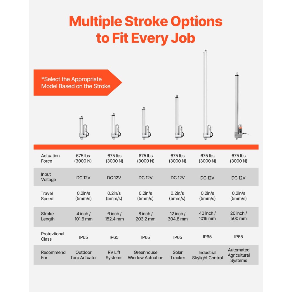 Ανώτερη προστασία IP65: Με ονομαστική αντοχή IP65 στη σκόνη και το νερό, ο γραμμικός ενεργοποιητής 12V της VEVOR είναι κατάλληλος για χρήση σε εξωτερικούς χώρους. Ιδανικός για χλοοκοπτικά μηχανήματα, συστήματα παρακολούθησης ηλιακών συλλεκτών και συστήματα άρδευσης. (Για μεγαλύτερη διάρκεια ζωής, δεν συνιστάται η παρατεταμένη έκθεση σε εξωτερικούς χώρους) Ισχυρή ροπή εξόδου: Η ισχυρή ροπή εξόδου 675 λίβρες (3000N) υπερέχει σε διάφορες απαιτητικές εργασίες όπως γεωργικά μηχανήματα, κατασκευαστικό εξοπλισμό και βιομηχανικό αυτοματισμό, εξασφαλίζοντας αξιόπιστη απόδοση σε εφαρμογές μεσαίου φορτίου. Εκτεταμένο εύρος κίνησης: Με εντυπωσιακή διαδρομή 40 ιντσών (1016 mm), αυτός ο γραμμικός ενεργοποιητής 12V προσφέρει εκτεταμένο εύρος κίνησης, καθιστώντας τον ιδανικό για εφαρμογές που απαιτούν μεγαλύτερο εύρος κίνησης και ακρίβεια. Ευέλικτες εφαρμογές: Ο ενεργοποιητής γραμμικής κίνησης μας ενσωματώνεται σε ένα ευρύ φάσμα εφαρμογών, από έπιπλα και οικιακούς αυτοματισμούς έως βιομηχανικά συστήματα, μηχανολογικό εξοπλισμό, μεταφορές και άλλα. Ενισχύστε τον αυτοματισμό σε κάθε βήμα. Βασικές προδιαγραφές: Ταχύτητα κίνησης: 0,2"/s (5 mm/s). Μήκος διαδρομής: 40" (1016 mm). Εκτεταμένο μήκος: 86" (2184,4 mm). Μήκος σε σύμπτυξη: 46" (1168,4 mm). Κατανάλωση ρεύματος: 6 Amps. Τάση εισόδου: DC 12V. Κύκλος λειτουργίας: 25%