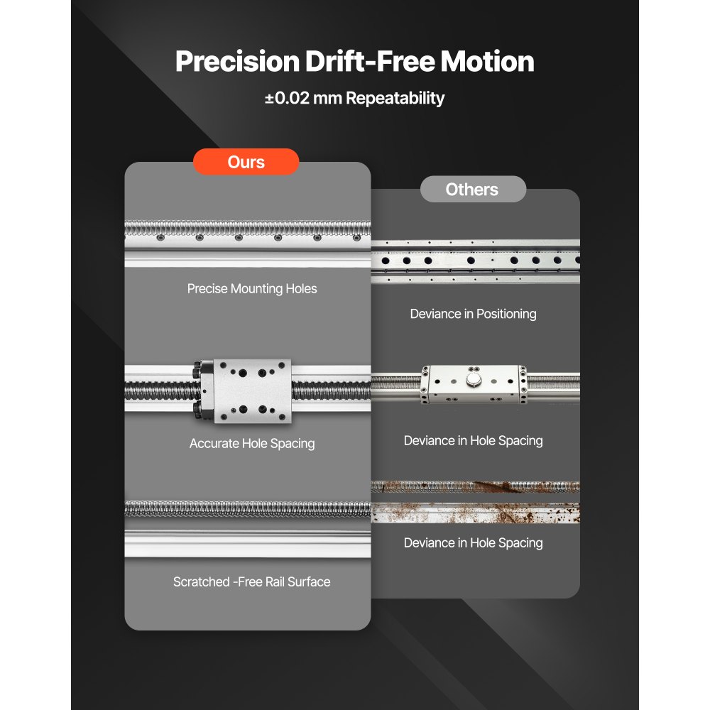 Βίδα 1 τεμαχίου με σφαιρίδια: Με διάμετρο 16 mm, ενεργό διαδρομή 1000 mm και ενσωματωμένο βηματικό κινητήρα NEMA 23, ο γραμμικός ενεργοποιητής σκηνής οδηγού CNC με σφαιροειδή βίδα εξασφαλίζει αξιόπιστη και σταθερή κίνηση σε περιβάλλοντα βιομηχανικού αυτοματισμού. Υψηλή ικανότητα φόρτωσης: Αυτός ο γραμμικός ενεργοποιητής βαθμίδας οδήγησης με σφαιρικό κοχλία υποστηρίζει εύκολα τόσο την οριζόντια όσο και την κάθετη κίνηση. Χειρίζεται έως και 10 kg οριζόντια και 5 kg κάθετα. Προστασία από σκουριά και διάβρωση: Διαθέτει αντιδιαβρωτική και ηλεκτρολυτικά επιμεταλλωμένη επίστρωση ≥10 μm, αυτός ο γραμμικός οδηγός κίνησης με σφαιρική βίδα αντιστέκεται στη διάβρωση και τη σκουριά ακόμη και σε υγρά περιβάλλοντα όπως υπόγεια για μακροχρόνια χρήση. Υψηλή ακρίβεια, χωρίς απόκλιση: Παρέχει επαναληψιμότητα ±0,02 mm, ο γραμμικός ενεργοποιητής σκηνής οδηγού με σφαιρική κίνηση κοχλία διαθέτει οπές και αποστάσεις τοποθέτησης με ακρίβεια κατεργασίας. Εξασφαλίζει ακριβή κίνηση μεγάλης διαδρομής και εύκολη εγκατάσταση. Ευρέως συμβατές εφαρμογές: Αυτή η γραμμική ράγα οδηγού κίνησης με σφαιρική βίδα χρησιμοποιείται ευρέως σε αυτοματοποιημένα μηχανήματα, όπως μηχανές χάραξης, φρέζες CNC και εκτυπωτές 3D