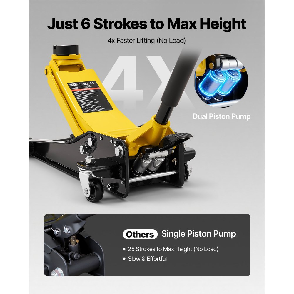 Έλεγχος πεντάλ ποδιού: Αυτός ο γρύλος δαπέδου χαμηλού προφίλ διαθέτει αναβαθμισμένο πεντάλ ποδιού για γρήγορη τοποθέτηση του βραχίονα ανύψωσης χωρίς φορτίο. Το πεντάλ βοηθά στην αποτελεσματική ευθυγράμμιση του γρύλου με τα σημεία ανύψωσης του οχήματος. Σημείωση: Μόνο για χρήση χωρίς φορτίο—μην χρησιμοποιείτε ποτέ το πεντάλ για να ανυψώσετε ένα όχημα. Προσαρμογέας SUV: Ο υδραυλικός γρύλος δαπέδου μας περιλαμβάνει έναν προσαρμογέα από καουτσούκ για SUV μεγέθους 2 x 1,4 ίντσες (50 x 36 mm). Ο αυλακωτός σχεδιασμός ευθυγραμμίζεται με τα σημεία ανύψωσης για SUV. Η παχιά κατασκευή από καουτσούκ αντιστέκεται στα ρωγμές και βοηθά στην εξασφάλιση σταθερής ανύψωσης. Ευρύ φάσμα ανύψωσης: Ο γρύλος δαπέδου ανυψώνεται από 2,95–19,7 ίντσες (75–500 mm). Ο σχεδιασμός χαμηλού προφίλ γλιστράει εύκολα κάτω από τα sedan, παρέχοντας παράλληλα άφθονο ύψος ανύψωσης. Σφίξτε τη βαλβίδα απελευθέρωσης και την αντλία για ανύψωση και, στη συνέχεια, γυρίστε τη λαβή αριστερόστροφα για ομαλό χαμήλωμα. Μέγιστη χωρητικότητα 3T: Ο γρύλος χαμηλού προφίλ μας υποστηρίζει έως και 3 τόνους (6.614 λίβρες), ανυψώνοντας με ευκολία sedan, SUV και pickup. Είναι ιδανικός για αλλαγές ελαστικών, σέρβις φρένων, αντικατάσταση εξάτμισης, συντήρηση ανάρτησης και άλλες επισκευές αυτοκινήτων. Ασφαλής και σταθερή στήριξη: Αυτός ο γρύλος αυτοκινήτου χαμηλού προφίλ, βαρέως τύπου, διαθέτει κατασκευή από ατσάλι και σύστημα αντλίας διπλού εμβόλου για σταθερή και αξιόπιστη ανύψωση. Η αναβαθμισμένη εργονομική λαβή εύκολης λαβής κάνει την τοποθέτηση και την άντληση πιο ομαλή και εύκολη.