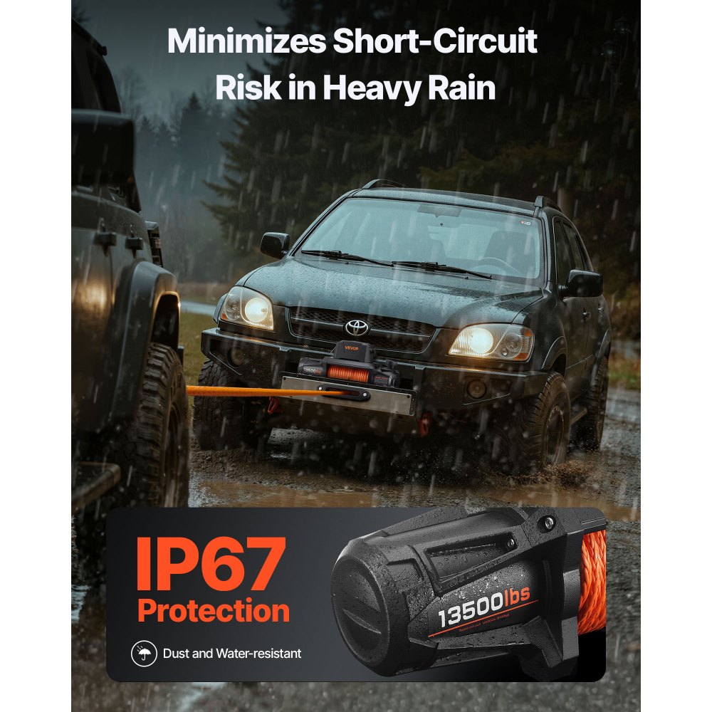 Ισχυρή έλξη 13.500 λίβρες: Αυτό το ηλεκτρικό βαρούλκο προσφέρει δύναμη έλξης 13.500 λίβρες, κάνοντας την ανάκτηση SUV ή pickup από λάσπη ή άμμο γρήγορη και χωρίς άγχος χωρίς ανησυχίες για παραμόρφωση του γραναζιού. Υψηλής Ισχύος Διάσωσης: Ο κινητήρας 7,2 ίππων του βαρούλκου τζιπ με πλανητικό γρανάζι 3 σταδίων 218,4:1 παρέχει σταθερή ισχύ έλξης. Ένα ασύρματο τηλεχειριστήριο 59 ποδιών εξασφαλίζει ασφαλή έλεγχο, ενώ ένα ενσύρματο τηλεχειριστήριο 9,8 ποδιών προσθέτει υποστήριξη ασφαλείας. Ανθεκτικό Συνθετικό Σχοινί: Το σχοινί 3/8 ίντσας x 92 πόδια του βαρούλκου είναι κατασκευασμένο από πολυαιθυλένιο 12 κλώνων, κατασκευασμένο για να αντέχει στην υπεριώδη ακτινοβολία και τη φθορά. Ακόμα και με την τριβή των κλώνων, το σχοινί παραμένει ισχυρό, ιδανικό για ρυμούλκηση οχημάτων σε απότομο έδαφος. Σφραγισμένος σχεδιασμός IP67: Το σφραγισμένο αδιάβροχο βαρούλκο προστατεύει από τη σκόνη και τη βροχή, λειτουργώντας ακόμα και σε αντίξοες καιρικές συνθήκες. Ένα επικαλυμμένο σώμα από κράμα αλουμινίου προσθέτει επιπλέον ανθεκτικότητα για αξιόπιστη απόδοση σε εξωτερικούς χώρους. Ασφαλές & Αξιόπιστο: Το σύστημα φρένων του βαρούλκου ρυμούλκησης κλειδώνει σταθερά για να αποτρέψει την κύλιση προς τα πίσω. Ένας οδηγός σχοινιού 4 στρώσεων και μια κόκκινη ζώνη προειδοποίησης παρέχουν σαφείς ειδοποιήσεις τάσης, βοηθώντας σας να αποφύγετε την υπερφόρτωση κατά τη μεταφορά βαρέων φορτίων.