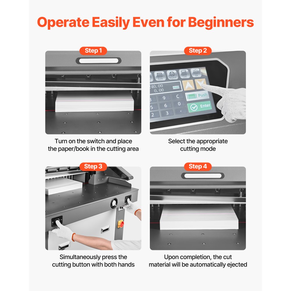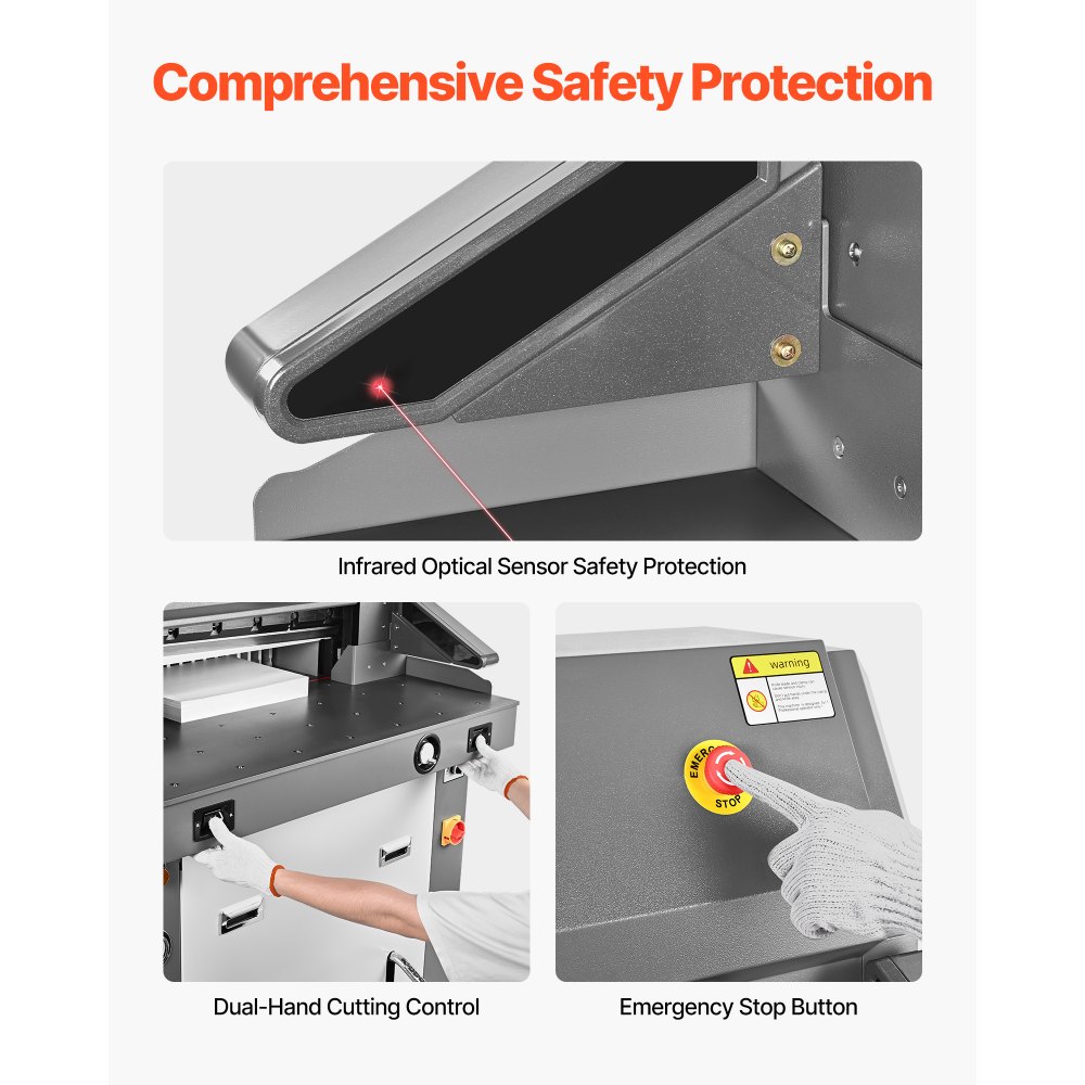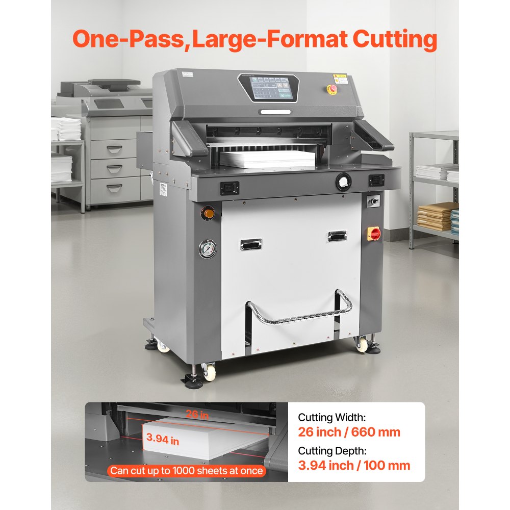Κοπή μεγάλου και χοντρού χαρτιού με ένα πέρασμα: Ο ηλεκτρικός κόφτης χαρτιού κόβει πλάτος έως 660 mm και πάχος 100 mm με ένα πέρασμα. Μπορεί να χειριστεί αποτελεσματικά στοίβες χαρτιού, βιβλία και χαρτόνια. (Το μηχάνημα καταναλώνει υψηλή ισχύ και ρεύμα κατά την εκκίνηση. Βεβαιωθείτε ότι ο οικιακός σας διακόπτης κυκλώματος μπορεί να χειριστεί πάνω από 40A.) Έξυπνα χειριστήρια: Ο ψηφιακός πίνακας αυτού του ηλεκτρικού κοπτικού χαρτιού αποθηκεύει έως και 100 προγράμματα κοπής. Επαναλάβετε εύκολα τις εργασίες με αυτόματη ρύθμιση πίεσης - ιδανικό για συχνές, επαναλαμβανόμενες παραγγελίες. Κοπή ακριβείας: Η ακρίβεια του κοπτικού χαρτιού μας εξασφαλίζει ομαλές και ομοιόμορφες άκρες. Ιδανικό για πιστοποιητικά, μενού, φυλλάδια και άλμπουμ όπου το επαγγελματικό φινίρισμα έχει σημασία. Σχεδιασμός Ολοκληρωμένης Ασφάλειας: Αυτή η μηχανή κοπής χαρτιού είναι εξοπλισμένη με αισθητήρες υπερύθρων, διπλό χειριστήριο και κουμπί διακοπής έκτακτης ανάγκης. Τα χαρακτηριστικά ασφαλείας πολλαπλών επιπέδων μειώνουν τους κινδύνους κατά την κοπή βαρέως τύπου. Εύκολο στη χρήση: Απλώς τοποθετήστε το χαρτί, ρυθμίστε το κουμπί ώθησης, επιβεβαιώστε τη θέση και πατήστε τα διπλά πλήκτρα. Εξοπλισμένο με πλήρη εργαλεία και ένα λεπτομερές εγχειρίδιο, ακόμη και οι αρχάριοι μπορούν να κόβουν με ασφάλεια και αποτελεσματικότητα.