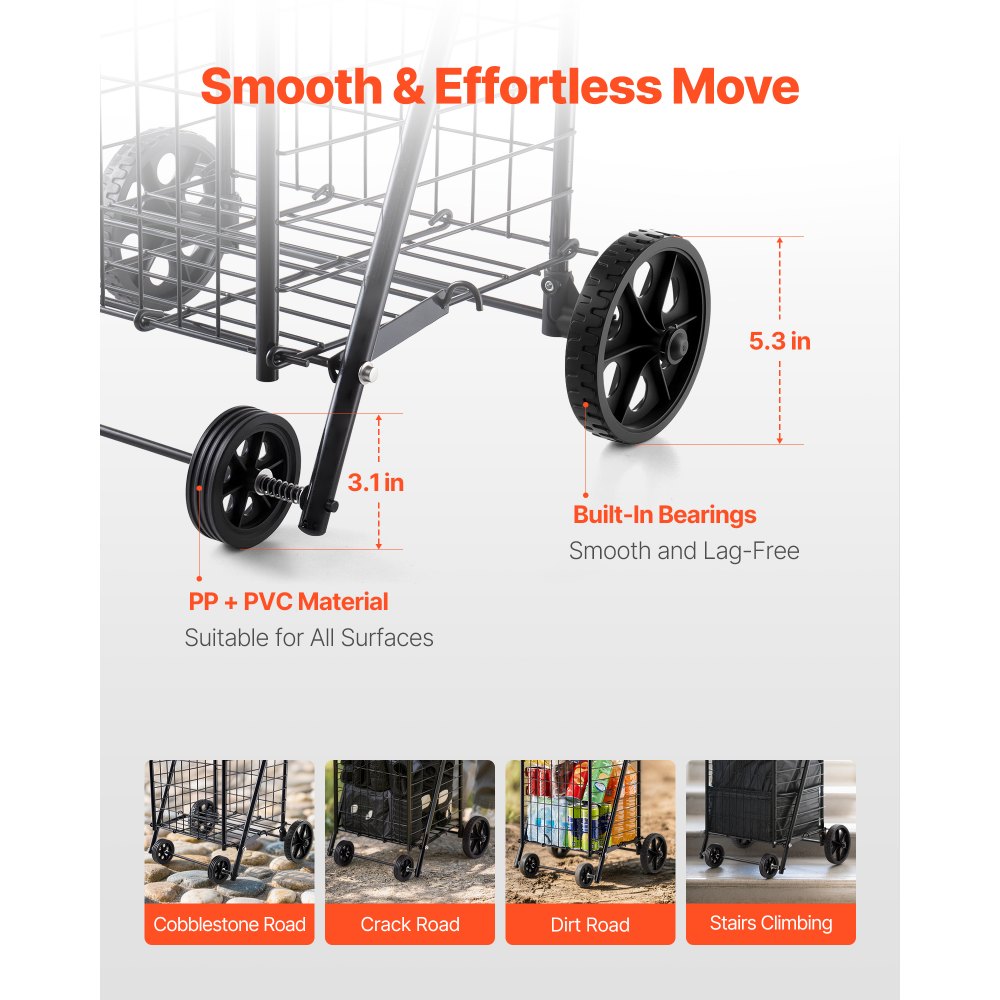 Εύκολη μεταφορά: Αυτό το βοηθητικό καρότσι χωράει έως και 40,8 κιλά με καλάθι 39 λίτρων, ιδανικό για ψώνια, είδη καθημερινής χρήσης και είδη κηπουρικής. Ένα αξιόπιστο καρότσι αγορών που σας γλιτώνει από ταξίδια και σας εμποδίζει να κουβαλάτε πολλές βαριές τσάντες. Ομαλή και Ευέλικτη Κινητικότητα: Το καρότσι αγορών πολλαπλών χρήσεων διαθέτει 4 τροχούς από PP και PVC για σταθερότητα σε διάφορες επιφάνειες. Οι πίσω τροχοί 5,3 ιντσών με ρουλεμάν κυλούν ομαλά σε ανώμαλα μονοπάτια, ενώ η αντιολισθητική λαβή μειώνει την πίεση του χεριού. Ανθεκτική κατασκευή: Κατασκευασμένο από μέταλλο υψηλής αντοχής με φινίρισμα ηλεκτροστατικής βαφής ανθεκτικό στη σκουριά και τις γρατσουνιές, το ρολό μας για πλυντήρια ρούχων είναι κατασκευασμένο για να διαρκεί. Η ενισχυμένη βάση προσθέτει σταθερότητα, ενώ το πυκνό πλέγμα διατηρεί τα αντικείμενα ασφαλή, καθιστώντας το ένα αξιόπιστο καρότσι για ψώνια παντοπωλείου. Εύκολη μεταφορά και αποθήκευση: Αυτό το καρότσι πλυντηρίου διπλώνει σε δευτερόλεπτα για να χωρέσει σε ένα πορτμπαγκάζ, ντουλάπα ή κάτω από το κρεβάτι, εξοικονομώντας χώρο για μικρά διαμερίσματα. Με βάρος μόλις 3 κιλά, είναι ένα ελαφρύ καρότσι αγορών ιδανικό για ηλικιωμένους ή οποιονδήποτε χρειάζεται εύκολη μεταφορά. Ευέλικτη χρήση: Συνδέστε το καλάθι και τη λαβή στο πλαίσιο και, στη συνέχεια, προσθέστε τους τροχούς για να το τοποθετήσετε. Αυτό το καρότσι αγορών είναι ιδανικό για ψώνια, πλυντήριο, πακέτα, κάμπινγκ ή αθλητικό εξοπλισμό, καθιστώντας το ένα πρακτικό καρότσι αγορών παντοπωλείου για καθημερινές ανάγκες.