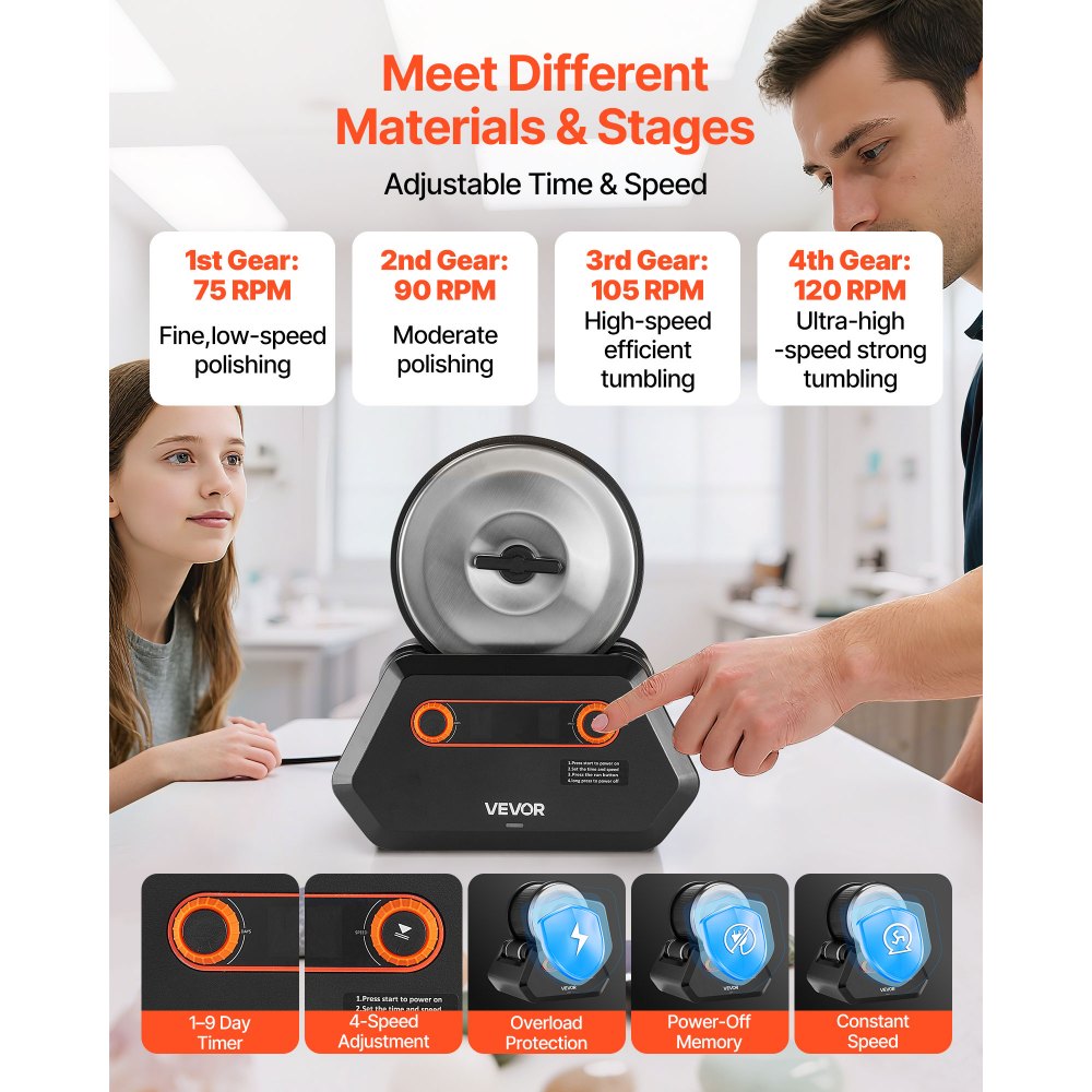 Κινητήρας άμεσης κίνησης χωρίς ιμάντα: Αυτό το κιτ ανατροπής πέτρας χρησιμοποιεί κινητήρα άμεσης κίνησης χαμηλής τάσης για ομαλότερο και πιο αποτελεσματικό στίλβωμα χωρίς μετάδοση κίνησης με ιμάντα, εξαλείφοντας τη φθορά και την αντικατάσταση του ιμάντα, μειώνοντας παράλληλα το κόστος συντήρησης. Λειτουργεί στα ≤35 dB, επιτρέποντάς σας να απολαμβάνετε μια ήσυχη και άνετη δημιουργική εμπειρία. Ομοιόμορφα Αποτελέσματα Γυάλισμα: Αυτό το κιτ γυαλίσματος πετρωμάτων περιλαμβάνει 8 τύπους ακατέργαστων πετρών, ο καθένας με μοναδικές υφές και χρώματα. Είτε είστε αρχάριος είτε έμπειρος λάτρης, σας βοηθά να μετατρέψετε τις ακατέργαστες πέτρες σε όμορφα πετράδια, αναδεικνύοντας τη φυσική τους λάμψη και ομορφιά. Ευέλικτη ρύθμιση: Ο κύλινδρος πέτρας μας διαθέτει χρονοδιακόπτη 1 έως 9 ημερών και 4 επίπεδα ταχύτητας που κυμαίνονται από 75 σ.α.λ. έως 120 σ.α.λ., καλύπτοντας τις ανάγκες στίλβωσης για διαφορετικά υλικά και στάδια. Με προστασία υπερφόρτωσης και μνήμη απενεργοποίησης, συνεχίζει αυτόματα τον υπόλοιπο κύκλο μετά από διακοπές. Ο σχεδιασμός σταθερής ταχύτητας εξασφαλίζει πιο ομοιόμορφα και συνεπή αποτελέσματα. Υψηλή χωρητικότητα φόρτωσης: Αυτό το στιλβωτικό πετρωμάτων διαθέτει βαρέλι βαρέως τύπου 1,5 κιλών που συγκρατεί περισσότερες πέτρες ταυτόχρονα, βελτιώνοντας σημαντικά την απόδοση στίλβωσης. Η μεγάλη χωρητικότητα εξοικονομεί χρόνο, εξασφαλίζει ομοιόμορφο στίλβωμα και μειώνει τις συχνές αναπληρώσεις για ευκολότερη λειτουργία. Πλήρες κιτ: Το κιτ για ποτήρια πέτρας περιλαμβάνει χειροκίνητο κιτ, διάφορες ακατέργαστες πέτρες, στρογγυλά λειαντικά, μικροκρυσταλλικό καρβίδιο του πυριτίου, σκόνη στίλβωσης, κόσκινο φίλτρου, κοίλες μπάλες ανακίνησης, μονούς δακτυλίους, κορδόνια κρεμαστών κοσμημάτων, επίπεδες βάσεις δακτυλίων και προσαρμογέα. Με όλα τα αξεσουάρ που παρέχονται, είναι ιδανικό για κατασκευές στο σπίτι ή για δραστηριότητες γονέα-παιδιού, επιτρέποντάς σας να απολαύσετε πλήρως τη μεταμόρφωση από ακατέργαστες πέτρες σε λαμπερούς πολύτιμους λίθους.