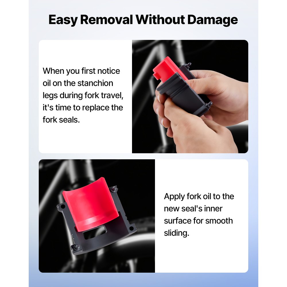 Πλήρη μεγέθη: Το κιτ πρέσας ρουλεμάν μας χειρίζεται διάφορα μεγέθη εργασιών αποσυναρμολόγησης ρουλεμάν. Είναι εξοπλισμένο με 14 τεμάχια συνήθως χρησιμοποιούμενων μεγεθών χιτωνίων δίσκου και πολλαπλά αξεσουάρ συναρμολόγησης για ολοκληρωμένα εργαλεία. Ανθεκτικότητα σε βαριά χρήση: Το εργαλείο κατσαβιδιού είναι κατασκευασμένο από χάλυβα υψηλής σκληρότητας, με παχιά χιτώνια δίσκου που αντέχουν σε δυνατά χτυπήματα από σφυριά ή σμίλες. Το σετ κατσαβιδιών μας διαθέτει οξειδωμένη μαύρη επίστρωση για αντοχή στη σκουριά και τη φθορά και ανθεκτικότητα. Εύκολη εγκατάσταση: Η ρύθμιση του κιτ οδηγού στεγανοποίησης ρουλεμάν απαιτεί την εφαρμογή λαδιού πιρουνιού στην εσωτερική επιφάνεια της νέας στεγανοποίησης για ομαλή ολίσθηση. Στη συνέχεια, στερεώστε τη στεγανοποίηση του ποδηλάτου και σύρετε το εργαλείο εγκατάστασης στεγανοποίησης αρκετές φορές μέχρι να τοποθετηθεί η στεγανοποίηση του πιρουνιού. Λειτουργία χωρίς ζημιές: Μπορείτε να συναρμολογήσετε μανίκια δίσκου χρησιμοποιώντας αξεσουάρ. Οι βίδες ασφαλίζουν με ασφάλεια τα μανίκια και οι γυαλισμένες άκρες αποτρέπουν την πρόκληση ζημιάς στα ρουλεμάν και σε άλλα εξαρτήματα. Το σετ κατσαβιδιών ρουλεμάν μας αντικαθιστά αναποτελεσματικές, ισχυρές μεθόδους όπως σφυριά ή σμίλες. Εύκολη αποθήκευση με εργαλειοθήκη: Για την επίλυση προβλημάτων αποθήκευσης εργαλείων, το κιτ στεγανοποίησης παρέχει ένα υψηλής αντοχής, αδιάβροχο πλαστικό κουτί με εσωτερικές σημάνσεις μεγέθους. Επιτρέπει την οργανωμένη αποθήκευση και την σαφή αναγνώριση, εξασφαλίζοντας αξιόπιστη αποθήκευση και φορητότητα.