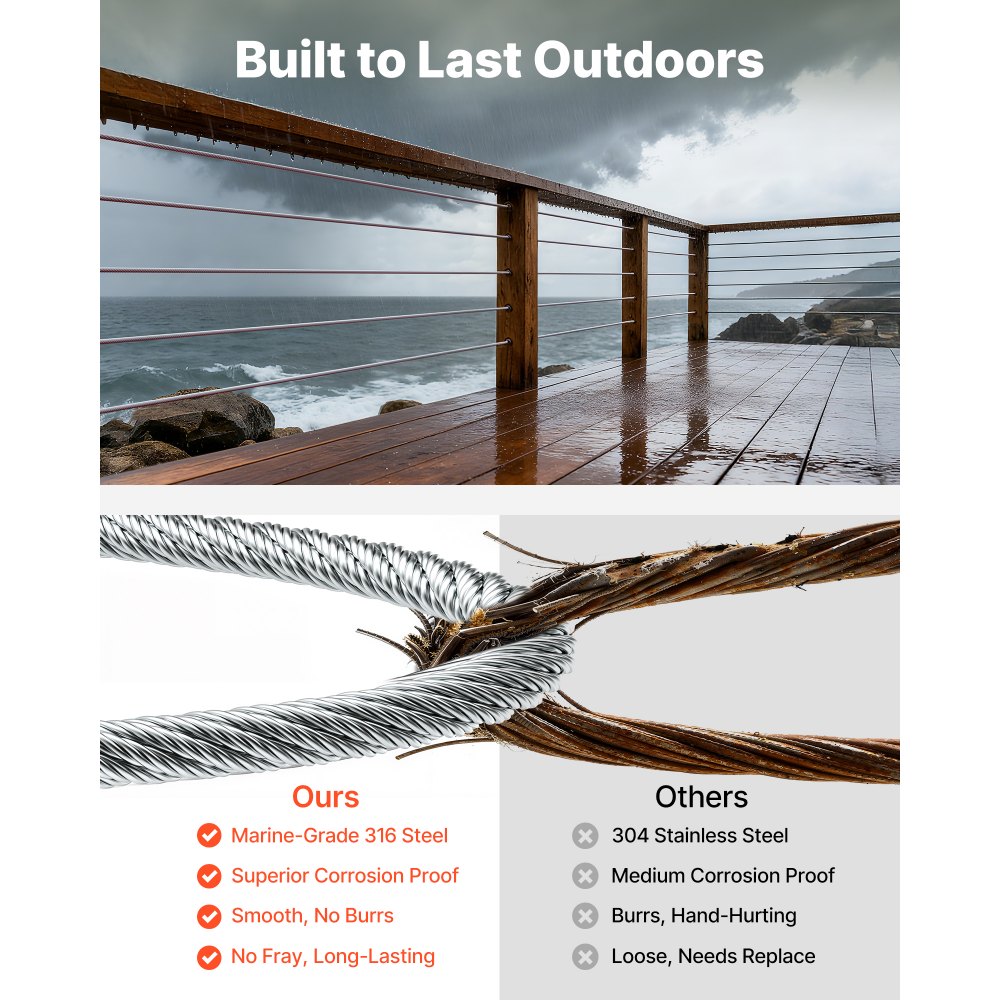 Ανοξείδωτο 316 Θαλάσσιας Ποιότητας: Αυτό το συρματόσχοινο από χάλυβα αντιστέκεται στη σκουριά σε παράκτιες ή υγρές περιοχές. Η σφιχτή τοποθέτηση 7x7 παραμένει ανθεκτική και η λεία, χωρίς γρατζουνιές επιφάνεια βοηθά στον ασφαλή χειρισμό και στην τακτοποίηση της εγκατάστασης. Διάμετρος 1/8 ίντσας & αντοχή σε θραύση 1.600 λίβρες: Αυτό το χαλύβδινο συρματόσχοινο προσφέρει σταθερή χωρητικότητα για κιγκλιδώματα, φράχτες και κρεμαστές ράγες. Διατηρείτε τις κατασκευές σταθερές για μεγάλη χρήση σε εσωτερικούς και εξωτερικούς χώρους υπό καθημερινά φορτία. Ανθεκτικός Σταυρωτός Σφιγκτήρας: Αυτός ο μεταλλικός σταυρωτός σφιγκτήρας ασφαλίζει πολλαπλά σύρματα στις διασταυρώσεις. Διατηρείτε τα σχοινιά σφιχτά με λιγότερη ολίσθηση—ιδανικός για πέργκολες αναρρίχησης, φράχτες και διατάξεις φωτισμού σε σχήμα γείσου. Πλήρες κιτ εξαρτημάτων: Αυτό το κιτ συρματόσχοινου περιλαμβάνει 8 εγκάρσιους σφιγκτήρες, 8 αγκύρια διαστολής, 20 καρφιά καρφιών (17 mm) και 1 κλειδί. Χειρίζεστε τις εγκαταστάσεις με μία κίνηση με λιγότερα έξτρα και πιο γρήγορα αποτελέσματα. Ευρεία εφαρμογή: Αυτό το μεταλλικό καλώδιο είναι κατάλληλο για κιγκλιδώματα σκαλοπατιών, φράχτες κήπου, κρεμαστά φωτιστικά, σκοινιά απλώματος, πέργκολες για κλήματα και ταΐστρες πουλιών. Αντιμετωπίζετε εργασίες σπιτιού, κήπου και DIY με ένα αξιόπιστο ρολό.
