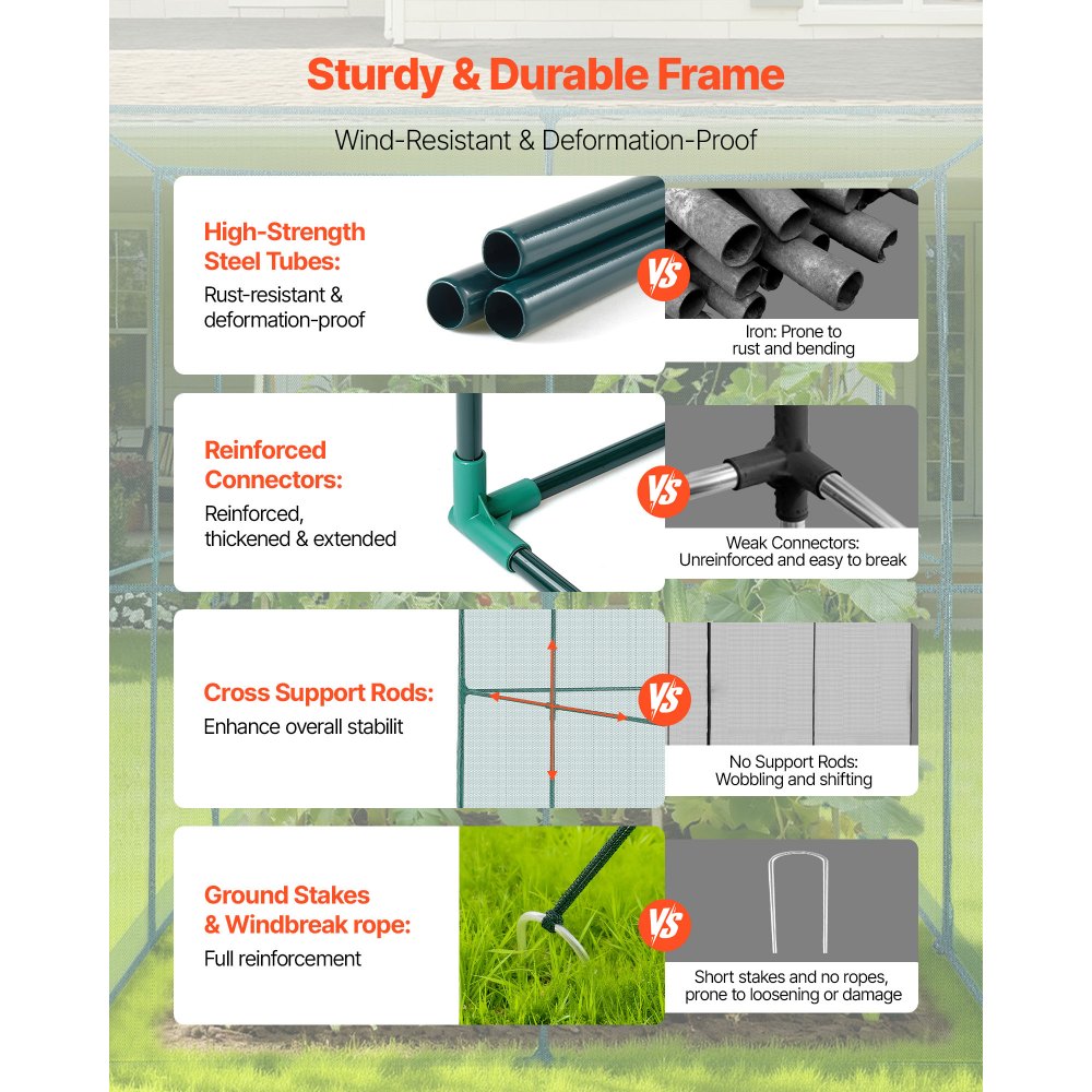 Ευρύχωρο εσωτερικό: Με διαστάσεις 114,17 x 76,38 x 76,38 ίντσες/2900 x 1940 x 1940 χιλιοστά, αυτά τα κλουβιά καλλιεργειών για κήπο παρέχουν άφθονο χώρο για λαχανικά, φρούτα, λουλούδια και άλλα φυτά να ευδοκιμήσουν χωρίς εξωτερικές παρεμβολές. Σταθερή και ανθεκτική στον άνεμο: Κατασκευασμένη από σωλήνες από χάλυβα με ηλεκτροστατική βαφή πούδρας, η σκηνή προστασίας φυτών μας είναι ανθεκτική στη σκουριά και τη διάβρωση. Οι ενισχυμένες πλαστικές αρθρώσεις και οι εγκάρσιες ράβδοι στήριξης προσθέτουν σταθερότητα, ενώ οι πάσσαλοι εδάφους σε σχήμα U και τα σχοινιά στήριξης παρέχουν αντοχή στον άνεμο. Αποτελεσματική προστασία: Κατασκευασμένο από ένα πολυεστερικό πλέγμα ανθεκτικό στο σχίσιμο πάχους 0,16 ίντσας/4 χιλιοστών, το κλουβί καλλιέργειας προστατεύει τα φυτά από τα ζώα. Οι οπές αέρα του επιτρέπουν την κυκλοφορία του αέρα, την έκθεση στο ηλιακό φως και τη διείσδυση του νερού, εξασφαλίζοντας επαρκή θρεπτικά συστατικά για την ανάπτυξη των φυτών. Πόρτα με φερμουάρ που τυλίγεται: Η πόρτα με φερμουάρ του κλουβιού των φυτών διαθέτει ενισχυμένες άκρες που παραμένουν ασφαλείς. Απλώς ανοίξτε το φερμουάρ και διπλώστε την κουρτίνα για να μαζέψετε ή να φροντίσετε τα φυτά και στη συνέχεια κλείστε την με φερμουάρ για να σχηματίσετε ένα πλήρως κλειστό φράγμα που κρατά τα ζώα έξω. Εύκολη εγκατάσταση: Με προσεγμένο σχεδιασμό, ο ψηλός κλωβός καλλιέργειας μας είναι εύκολος στην εγκατάσταση χωρίς εργαλεία ή πολύπλοκες εργασίες. Απλώς συναρμολογήστε τους χαλύβδινους σωλήνες με τους συνδετήρες, τοποθετήστε το προστατευτικό πλέγμα και ενισχύστε τους με δοκούς ή πέτρες.