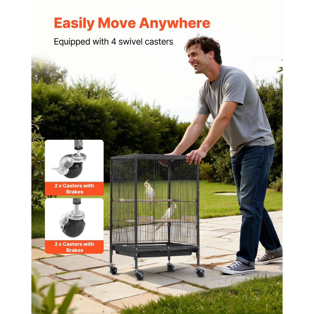 Ευρύχωρος χώρος: Με διαστάσεις 18 x 18 x 29,5 ίντσες και απόσταση μεταξύ των ράβδων 0,4 ίντσες, το κλουβί πουλιών χωράει 1-2 μικρά ή μεσαία πουλιά, όπως κόνουρες, πιτσουνάκια, παπαγαλάκια και καναρίνια. Παρέχει άφθονο χώρο για να πηδούν και να τεντώνουν τα φτερά τους με ευελιξία. Σταθερό & Αξιόπιστο: Κατασκευασμένο από σφυρήλατο σίδερο με φινίρισμα ηλεκτροστατικής βαφής, το κλουβί πτήσης πουλιών μας εξασφαλίζει αντοχή στο νερό και τη σκουριά. Η σταθερή δομή του πλαισίου, οι παχύρρευστοι σωλήνες και οι φράχτες αντέχουν στην παραμόρφωση, ενώ μια ασφαλής κλειδαριά εμποδίζει τα πουλιά να ξεφύγουν. Πλήρως λειτουργικό: Το κλουβί των κοκατίλ διαθέτει ανοιχτό σχεδιασμό για εύκολη αλληλεπίδραση, με πλαστικές ταΐστρες για τη μείωση της ζημιάς στο ράμφος. Οι πολλαπλές κούρνιες και τα οριζόντια σύρματά του παρέχουν άφθονο χώρο για ορθοστασία και ξεκούραση, καθώς και σταθερή στήριξη λαβής. Εύκολη Μετακίνηση: Εξοπλισμένο με τέσσερις περιστρεφόμενες ρόδες 360°, το κλουβί παπαγάλων μετακινείται ομαλά σε οποιοδήποτε σημείο, με δύο ρόδες που κλειδώνουν για να αποφεύγεται η ολίσθηση. Είτε μετακινείστε από το σαλόνι στο μπαλκόνι είτε από εσωτερικό σε εξωτερικό χώρο, μετακινείται εύκολα. Εύκολος καθαρισμός: Το μεγάλο κλουβί πουλιών μας διαθέτει έναν συρόμενο δίσκο στο κάτω μέρος, επιτρέποντάς σας να τον τραβήξετε έξω για εύκολο καθάρισμα. Η κάτω μεταλλική σχάρα χωρίζει τα πουλιά από τα περιττώματά τους, αποφεύγοντας την άμεση επαφή των πουλιών με ρύπους για να διασφαλιστεί η τάξη.