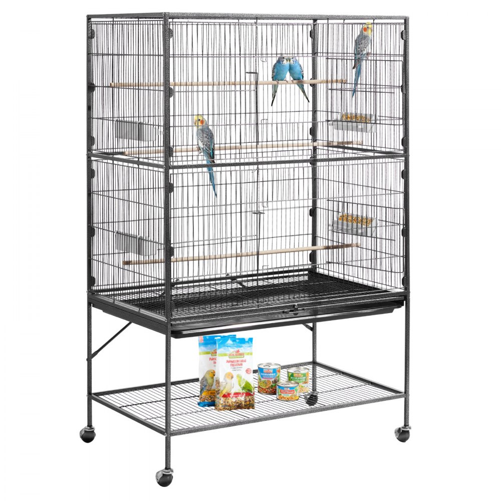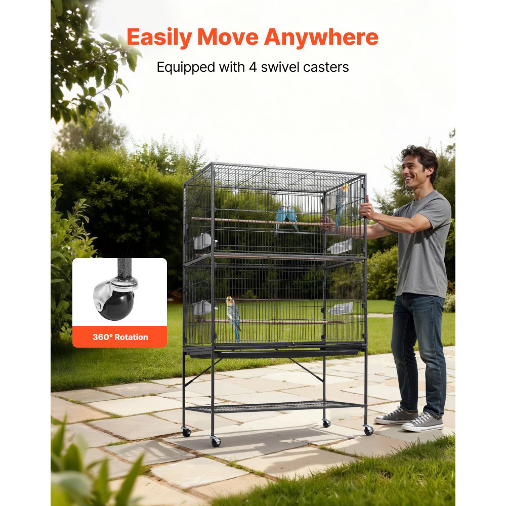 Ευρύχωρος Χώρος: Με διαστάσεις 94 x 104 x 104 εκατοστά και απόσταση μεταξύ των ράβδων 0,6 ίντσες, αυτό το κλουβί πουλιών χωράει 3-4 μεσαία ή μεγάλα πουλιά (κονούρες, πιτσουνάκια, παπαγαλάκια, παπαγαλάκια μοναχού, αφρικανικούς γκρίζους παπαγάλους). Παρέχει άφθονο χώρο για να πηδούν και να τεντώνονται. Σταθερό & Αξιόπιστο: Κατασκευασμένο από σφυρήλατο σίδερο με φινίρισμα ηλεκτροστατικής βαφής, το κλουβί πτήσης πουλιών μας εξασφαλίζει αντοχή στο νερό και τη σκουριά. Η σταθερή δομή του πλαισίου, οι παχύρρευστοι σωλήνες και οι φράχτες αντέχουν στην παραμόρφωση, ενώ μια ασφαλής κλειδαριά εμποδίζει τα πουλιά να ξεφύγουν. Πλήρως λειτουργικό: Το κλουβί των κοκατίλ διαθέτει πλαστικές ταΐστρες για τη μείωση των ζημιών στο ράμφος. Οι πολλαπλές κούρνιες και τα οριζόντια σύρματά του παρέχουν άφθονο χώρο για ορθοστασία και ξεκούραση, καθώς και σταθερή στήριξη στο κράτημα. Διαθέτει ράφι για την αποθήκευση τροφής για πουλιά και άλλων μικροαντικειμένων. Εύκολη Μετακίνηση: Εξοπλισμένο με τέσσερις περιστρεφόμενες ρόδες 360°, το κλουβί για παπαγάλους μετακινείται ομαλά σε οποιοδήποτε σημείο. Είτε μετακινείστε από το σαλόνι στο μπαλκόνι είτε από εσωτερικό σε εξωτερικό χώρο, μετακινείται εύκολα, επιτρέποντας στα πουλιά σας να απολαμβάνουν καθαρό αέρα και ηλιακό φως οποιαδήποτε στιγμή. Εύκολος καθαρισμός: Το μεγάλο κλουβί πουλιών μας διαθέτει έναν συρόμενο δίσκο στο κάτω μέρος, επιτρέποντάς σας να τον τραβήξετε έξω για εύκολο καθάρισμα. Η κάτω μεταλλική σχάρα χωρίζει τα πουλιά από τα περιττώματά τους, αποφεύγοντας την άμεση επαφή των πουλιών με ρύπους για να διασφαλιστεί η τάξη.