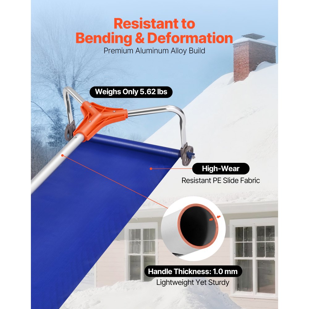 Εξαιρετικά φαρδιά λεπίδα: Η εκχιονιστική μηχανή για στέγες σπιτιών είναι εξοπλισμένη με λεπίδα 17 ιντσών για την αποτελεσματική απομάκρυνση του χιονιού από τις στέγες, ιδιαίτερα κατάλληλη για μεγάλες περιοχές. Σας επιτρέπει να καθαρίζετε περισσότερο χιόνι με μία κίνηση, μειώνοντας τις επαναλαμβανόμενες εργασίες και εξοικονομώντας προσπάθεια. Υλικό από κράμα αλουμινίου: Κατασκευασμένη από κράμα αλουμινίου, αυτή η τσουγκράνα χιονοσκεπής είναι στιβαρή και ανθεκτική. Με αντοχή στη διάβρωση και την πίεση, δεν παραμορφώνεται ή καταστρέφεται εύκολα μετά από μακροχρόνια χρήση. Ο παχύς σχεδιασμός ενισχύει τη συνολική αντοχή και σταθερότητα. Ρυθμιζόμενη λαβή: Η τσουγκράνα χιονιού στέγης διαθέτει ρυθμιζόμενη λαβή για να ταιριάζει σε διαφορετικά ύψη στέγης, επιτρέποντας την εύκολη αφαίρεση χωρίς σκάλες. Ο εργονομικός στρογγυλός σχεδιασμός της λαβής παρέχει άνετο κράτημα, εξασφαλίζοντας ασφαλές κράτημα ακόμα και σε κρύο καιρό. Τροχοί ομαλής κύλισης: Αυτοί οι τροχοί στις ράγες της οροφής για την απομάκρυνση του χιονιού αποτρέπουν τις γρατσουνιές και τις ζημιές στην επιφάνεια της οροφής. Ο σχεδιασμός των τροχών εξασφαλίζει ομαλή ολίσθηση σε πλαγιές ή ανώμαλες επιφάνειες, βελτιώνοντας τον έλεγχο για πιο ακριβή απομάκρυνση του χιονιού. Εύκολη εγκατάσταση και αποθήκευση: Η τσουγκράνα στέγης μπορεί να συναρμολογηθεί εύκολα χωρίς εργαλεία. Η αποσπώμενη λαβή εξοικονομεί χώρο για συμπαγή αποθήκευση. Είναι ιδανική για στέγες κατοικιών, γκαράζ και αυτοκινήτων για τον καθαρισμό χιονιού και πεσμένων φύλλων χωρίς κόπο.