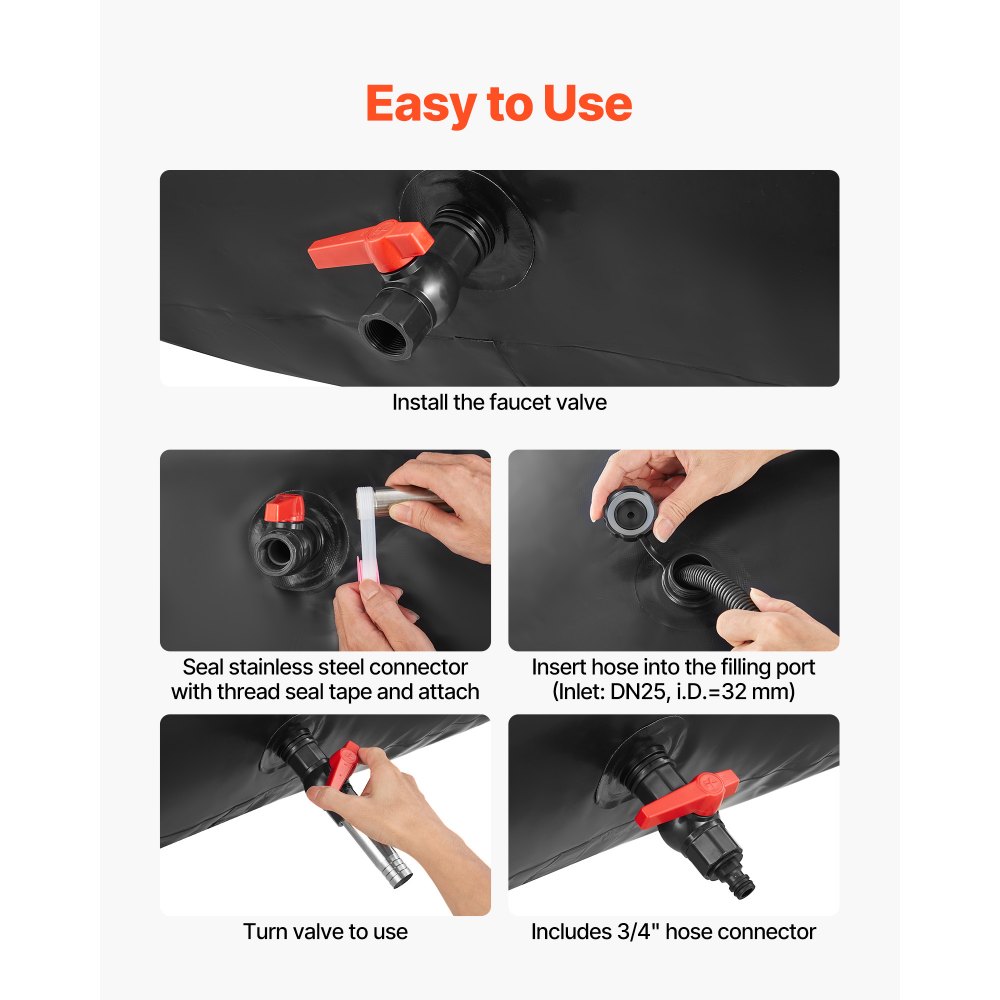 Τσάντα αποθήκευσης νερού 264,2 γαλονιών: Η τσάντα αποθήκευσης νερού από PVC έχει διαστάσεις 78,7 x 39,8 x 20,1 ίντσες, και χωράει έως και 1000 λίτρα/264,2 γαλόνια—ιδανική για άρδευση, παροχή νερού για τροχόσπιτα ή αποθήκευση νερού έκτακτης ανάγκης. Συνοδεύεται από πλήρες κιτ αξεσουάρ και κιτ επισκευής για εύκολη χρήση. PVC διπλής στρώσης 1000D: Κατασκευασμένο από παχύ διπλό ύφασμα 1000D με επίστρωση PVC, ενισχυμένο με εσωτερικό στρώμα πλέγματος ανθεκτικό στη φθορά και το σχίσιμο, αυτή η σακούλα αποθήκευσης νερού αντέχει σε θερμοκρασίες από 5°F έως 167°F. Αυτή η δομή μειώνει τη γήρανση και παρατείνει τη διάρκεια ζωής της σακούλας. Αναβαθμισμένη Σφράγιση: Η θερμοκόλληση υψηλής θερμοκρασίας ενισχύει τις διπλές ραφές PVC. Οι διπλές θερμοκολλημένες θύρες αντιστέκονται στο σκίσιμο και ενισχύουν την αντοχή στην πίεση. Οι προεγκατεστημένοι δακτύλιοι στεγανοποίησης στην έξοδο (συν ένας επιπλέον δακτύλιος αντικατάστασης) και η ταινία στεγανοποίησης που περιλαμβάνονται εξασφαλίζουν μια σταθερή, χωρίς διαρροές σύνδεση με τη βρύση/σύνδεσμο. Εύκολη χρήση: Η πτυσσόμενη σακούλα αποθήκευσης νερού διαθέτει προεγκατεστημένα εξαρτήματα εισόδου (DN25, αρσενικό σπείρωμα 32 mm) και εξόδου (DN20, αρσενικό σπείρωμα 25 mm). Απλώς συνδέστε τη βρύση στην έξοδο και έναν εύκαμπτο σωλήνα κήπου για να γεμίσετε. Έτοιμη για χρήση σε λίγα λεπτά. Φορητό & Εύκολο στην αποθήκευση: Η φορητή θήκη νερού διαθέτει τέσσερις ενισχυμένους βρόχους μεταφοράς που επιτρέπουν την ασφαλή τοποθέτηση σε καρότσες pickup, SUV ή στην οροφή για ασφαλή μεταφορά. Το εύκαμπτο υλικό PVC διπλώνει επίπεδα για συμπαγή αποθήκευση όταν δεν χρησιμοποιείται, εξαλείφοντας την ανάγκη για ογκώδεις δεξαμενές νερού.