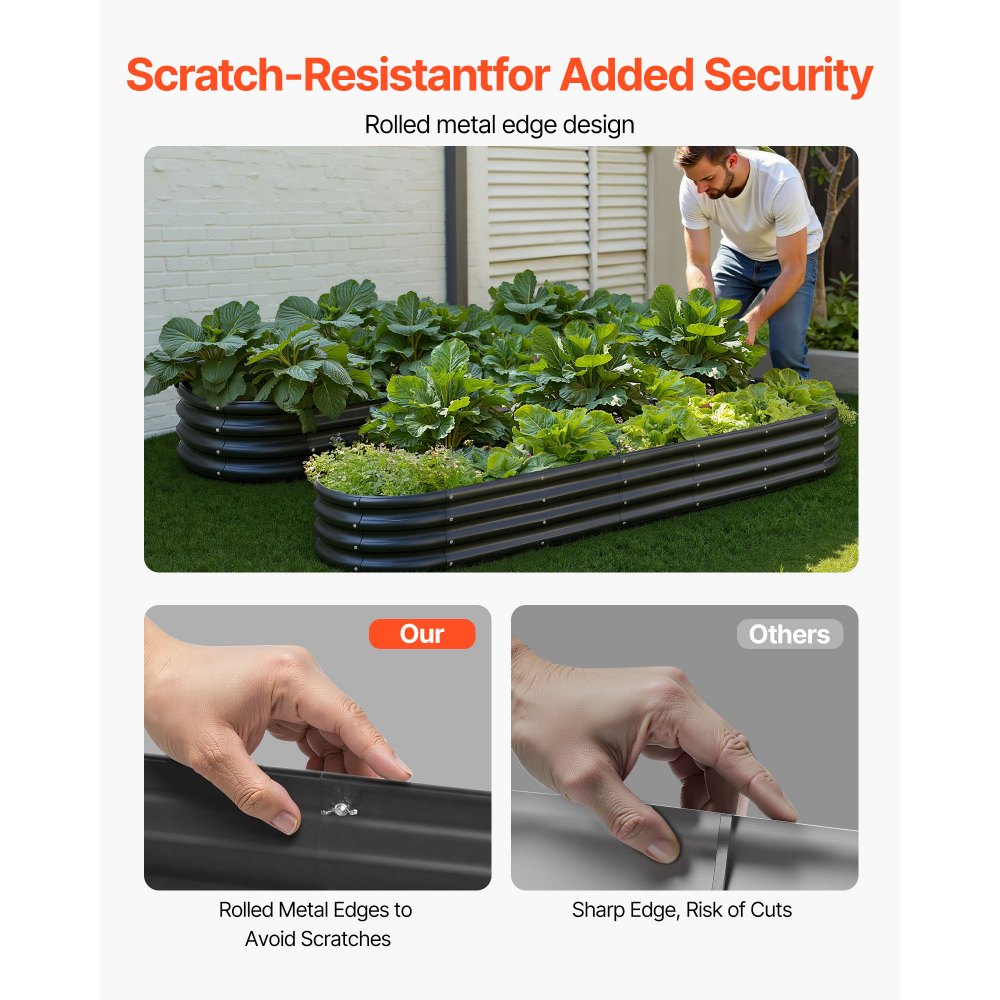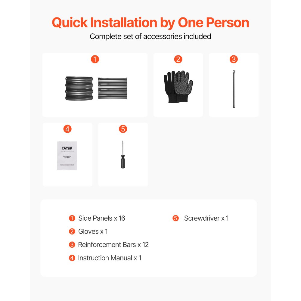 Δημιουργήστε έναν εκπληκτικό κήπο: Το υπερυψωμένο παρτέρι μας 2,5 x 1,5 x 1,5 ποδιών παρέχει άφθονο χώρο ανάπτυξης για τα φυτά σας. Το βάθος του 1,5 ποδιού είναι ιδανικό για διάφορα φυτά. Καλλιεργήστε λαχανικά, φρούτα, λουλούδια και βότανα σε κήπους, αγροκτήματα, χωράφια ή ανοιχτούς χώρους. Ανθεκτικό και αξιόπιστο: Κατασκευασμένο από γαλβανισμένα πάνελ 0,4 mm, ανθεκτικά στη σκουριά, με ηλεκτροστατική βαφή πούδρας, αυτό το μεταλλικό υπερυψωμένο παρτέρι είναι στιβαρό και κατασκευασμένο για να διαρκεί. Οι 12 εσωτερικές ράβδοι σε σχήμα Χ προσθέτουν σταθερότητα για μακροχρόνια χρήση σε εξωτερικούς χώρους. Ασφαλής χρήση: Η υπερυψωμένη γλάστρα μας διαθέτει κυλιόμενες άκρες και στρογγυλεμένες γωνίες για να μειωθεί η πιθανότητα τραυματισμού κατά τη χρήση. Συνοδεύεται επίσης από ένα ζευγάρι γάντια για την ελαχιστοποίηση των γρατζουνιών από τα χέρια, επιτρέποντάς σας να απολαμβάνετε μια ομαλή εμπειρία κηπουρικής. Εύκολη εγκατάσταση: Με ολοκληρωμένες βίδες και προ-τρυπημένο σχεδιασμό, το υπερυψωμένο παρτέρι μπορεί να συναρμολογηθεί εύκολα ακολουθώντας το εγχειρίδιο. Χρειάζονται μόνο 15 λεπτά για να τοποθετηθεί χωρίς να απαιτούνται επιπλέον εργαλεία, καθιστώντας το ιδανικό για λάτρεις της κηπουρικής, ακόμη και για αρχάριους. Τι θα πάρετε: Το υπερυψωμένο παρτέρι μας περιλαμβάνει 16 πλαϊνά πάνελ, 12 εγκάρσιες ράβδους, 1 ζευγάρι γάντια, 1 κατσαβίδι και 1 εγχειρίδιο χρήστη