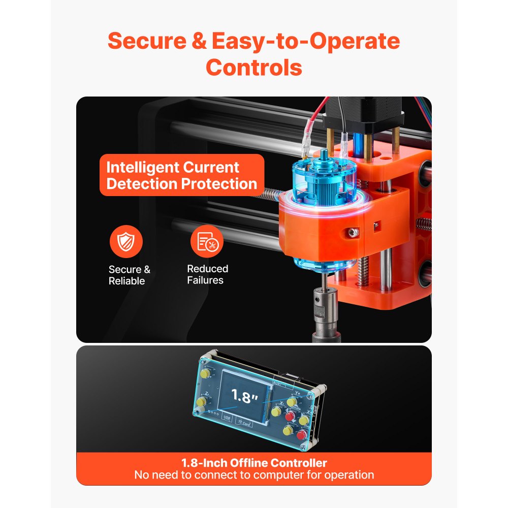 Υψηλής Ακριβείας Χάραξη: Η μηχανή φρέζας CNC διαθέτει σώμα από κράμα αλουμινίου και βάση ανθεκτικής κατασκευής 1,57 ίντσας (4 cm) για σταθερότητα και μειωμένους κραδασμούς. Ο άξονας 60W και η πλακέτα ελέγχου 32-bit προσφέρουν ακρίβεια επαναλαμβανόμενης τοποθέτησης ≤0,07 mm. Μεγάλη επιφάνεια εργασίας και δυνατότητα επέκτασης: Απολαύστε μια επιφάνεια εργασίας 11,81 x 7,08 x 1,57 (300 x 180 x 40 mm), επεκτάσιμη έως και 15,75 ίντσες (400 mm) στον άξονα Y. Αυτή η φρέζα ξύλου CNC υποστηρίζει επέκταση μονάδας λέιζερ για ευελιξία. Σημείωση: Τα αξεσουάρ επέκτασης δεν περιλαμβάνονται, πωλούνται ξεχωριστά. Ευρεία συμβατότητα λογισμικού: Αυτή η φρέζα ξύλου CNC είναι συμβατή με όλο το λογισμικό που υποστηρίζει το firmware GRBL f1.1. Περιλαμβάνει το λογισμικό Candle για εύκολη εγκατάσταση. Λειτουργεί με συστήματα Mac/Windows/Linux και υποστηρίζει CNC (Candle), Easel, LaserGRBL και LightBurn. Εύκολη συναρμολόγηση και λειτουργία: Γρήγορη εγκατάσταση με λεπτομερείς οδηγίες. Αυτή η μηχανή κοπής CNC είναι κατασκευασμένη με χειριστήριο εκτός σύνδεσης 1,8 ιντσών, επιτρέποντάς σας να λειτουργείτε χωρίς υπολογιστή. Ένα περιστροφικό κουμπί παρέχει ακριβή έλεγχο του άξονα για εύκολη χάραξη. Ασφαλής και ανθεκτική κατασκευή: Εξοπλισμένη με βηματικό κινητήρα, αυτή η φρέζα ξύλου CNC εξασφαλίζει ομαλή και αθόρυβη λειτουργία (≤75 dB). Ο άξονας διαθέτει προστασία ανίχνευσης ρεύματος, μειώνοντας τα σφάλματα και παρατείνοντας τη διάρκεια ζωής έως και 5000 ώρες αξιόπιστης χρήσης.