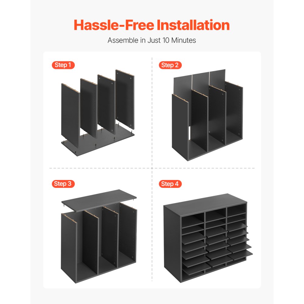 Ευρύχωρος σχεδιασμός 24 τμημάτων: Γνωρίστε τον οργανωτή βιβλίων μας—τη νέα σας λύση για έναν χώρο εργασίας χωρίς ακαταστασία! Με 24 ευρύχωρα τμήματα διατεταγμένα σε 3 στήλες και 8 σειρές, θα έχετε άφθονο χώρο για να αποθηκεύετε τακτοποιημένα βιβλία, έγγραφα, περιοδικά και πολλά άλλα. Κατασκευασμένος για να αντέχει: Ο ξύλινος οργανωτής βιβλίων μας είναι κατασκευασμένος από στιβαρή μοριοσανίδα P2 και MDF, με κάθε ράφι να αντέχει έως και 10 κιλά. Είτε αποθηκεύετε βαριά αρχεία είτε καθημερινά αντικείμενα, αυτός ο οργανωτής είναι στιβαρός. Επιπλέον, είναι πιστοποιημένος από την EPA, επομένως είναι ασφαλής για εσάς και την οικογένειά σας. Η λεία, γυαλισμένη επιφάνεια είναι αδιάβροχη, ανθεκτική στις γρατσουνιές και καθαρίζεται εύκολα με σκούπισμα. Προσαρμόσιμη αποθήκευση: Προσαρμόστε το γραμματοκιβώτιο του γραφείου στις ανάγκες σας! Κάθε διαμέρισμα έχει διαστάσεις 9,2 x 11,1 x 2,2 ίντσες / 234 x 282 x 56 mm και μπορεί να χωρέσει έως και 500 φύλλα χαρτιού A4. Με ρυθμιζόμενα ύψη ραφιών που κυμαίνονται από 1,0-2,2 ίντσες / 2,5-5,5 cm, μπορείτε εύκολα να τροποποιήσετε ή να αφαιρέσετε ράφια για να φιλοξενήσετε μεγαλύτερα αρχεία ή είδη γραφείου. Εύκολη Συναρμολόγηση: Χωρίς ταλαιπωρία, χωρίς φασαρία! Ο ταξινομητής ξύλινων αρχείων διαθέτει απλό σχεδιασμό πάνελ και σαφείς οδηγίες, επιτρέποντάς σας να τον συναρμολογήσετε σε μόλις 10 λεπτά. Οργανώστε τον χώρο σας γρήγορα και εύκολα. Ευέλικτες χρήσεις: Από το γραφείο μέχρι την τάξη, ακόμη και στο σπίτι, ο οργανωτής αλληλογραφίας γραφείου προσαρμόζεται στις ανάγκες αποθήκευσης. Διατηρήστε τα αρχεία σας τακτοποιημένα στον χώρο εργασίας, οργανώστε τις εργασίες των μαθητών στην τάξη ή τακτοποιήστε βιβλία, περιοδικά και παιχνίδια στο σπίτι. Είναι μια ευέλικτη προσθήκη σε κάθε χώρο!