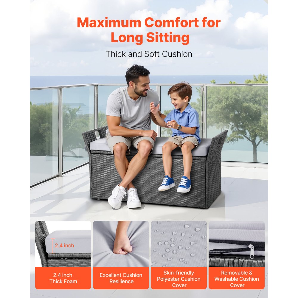 Συνδυασμός Αποθήκευσης & Καθισμάτων: Με εσωτερικές διαστάσεις 15,7 × 35 × 13 ίντσες (40 × 89 × 33 cm), αυτός ο εξωτερικός πάγκος αποθήκευσης 2 σε 1 χωράει άνετα δύο άτομα και προσφέρει άφθονο χώρο αποθήκευσης για διάφορα αντικείμενα. Διαθέτει πνευματική ράβδο στήριξης για εύκολη και ασφαλή πρόσβαση, αποτρέποντας το μαγκωμα των δακτύλων. Η πλαϊνή λαβή διευκολύνει τη μετακίνηση. Ανθεκτικό και στιβαρό: Κατασκευασμένο με πλαίσιο από κράμα χάλυβα, αυτό το παγκάκι αποθήκευσης από ρατάν πολυαιθυλενίου αντέχει έως και 200 κιλά (400 λίβρες), παρέχοντας μια σταθερή δομή που δεν παραμορφώνεται ή ταλαντεύεται εύκολα με την πάροδο του χρόνου. Το ρατάν πολυαιθυλενίου είναι ανθεκτικό στο ράγισμα και το ξεθώριασμα, ιδανικό για μακροχρόνια χρήση σε εξωτερικούς χώρους. Μαλακό μαξιλάρι: Ο πάγκος καταστρώματος μας διαθέτει ένα μαλακό μαξιλάρι πάχους 2,4 ιντσών με γέμιση από σφουγγάρι υψηλής ποιότητας για άνετο κάθισμα, ακόμα και κατά τη διάρκεια παρατεταμένης χρήσης. Το κάλυμμα του μαξιλαριού είναι κατασκευασμένο από ανθεκτικό ύφασμα πολυεστέρα, αφαιρούμενο και πλενόμενο για εύκολο καθάρισμα. Εύκολη εγκατάσταση: Το κουτί αποθήκευσης από ρατάν συνοδεύεται από σαφείς και λεπτομερείς οδηγίες εγκατάστασης, κάνοντας την εγκατάσταση γρήγορη και εύκολη χωρίς την απογοήτευση περίπλοκων βημάτων. Θα το έχετε έτοιμο για χρήση σε χρόνο μηδέν. Ευέλικτος & Κομψός Σχεδιασμός: Ο κομψός και λειτουργικός σχεδιασμός του ταιριάζει σε διάφορους εσωτερικούς και εξωτερικούς χώρους, όπως κήπους, βεράντες και χώρους δίπλα στην πισίνα. Ο εξωτερικός πάγκος με αποθηκευτικό χώρο προσθέτει πρακτικότητα και αισθητική αξία στον εξωτερικό σας χώρο διαβίωσης.
