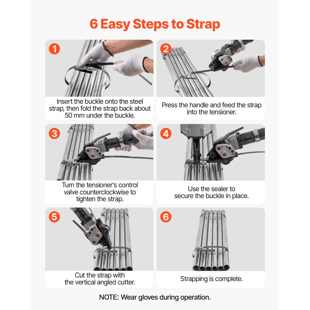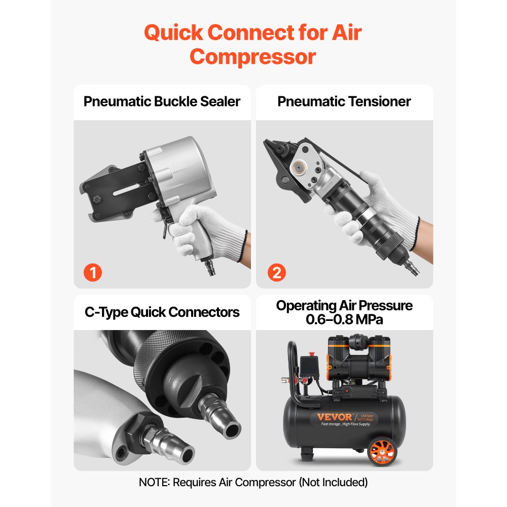 Δέσιμο με ιμάντες βαρέως τύπου: Αυτή η πνευματική μηχανή δεσίματος με ιμάντες παρέχει τάση 8500N, διευκολύνοντας την ασφάλιση παλετών, πέτρας, χάλυβα και ρολλών. Εξοικονομεί προσπάθεια, εξοικονομεί χρόνο και αυξάνει την απόδοση για δύσκολες εργασίες. Σχεδιασμένο για χαλύβδινους ιμάντες: Η βαρέως τύπου πρέσα διαιρούμενου τύπου περιλαμβάνει εντατήρα και στεγανοποιητικό σε διαιρούμενο σχεδιασμό για ευέλικτη χρήση. Κατάλληλη για χαλύβδινους ιμάντες πλάτους 0,748 ίντσες και πάχους 0,0315-0,0472 ίντσες, ιδανική για ομαδικές εργασίες. Ισχυρή Σφράγιση Αγκράφας: Το πνευματικό σφράγισμα ασκεί ισχυρή δύναμη σε ατσάλινες ή πλαστικές αγκράφες, δημιουργώντας μια σφιχτή και ασφαλή σύνδεση. Η μηχανή μεταλλικής ταινίας διατηρεί τους ιμάντες σταθερούς χωρίς να χαλαρώνουν. (Σημείωση: οι αγκράφες δεν περιλαμβάνονται.) Συνεχής σύνδεση: Τόσο ο εντατήρας όσο και ο στεγανοποιητής κοπής διαθέτουν ταχυσύνδεσμους τύπου C και λειτουργούν με πίεση αέρα 0,6-0,8 Mpa. Δεν απαιτείται φόρτιση, υποστηρίζοντας συνεχή σύνδεση για ογκώδη βαριά φορτία. Απλό στη λειτουργία: Οι χρήστες απλώς περνούν το λουρί, το σφίγγουν με τον εντατήρα και το ασφαλίζουν με το στεγανοποιητικό. Ακόμα και οι αρχάριοι μπορούν να χρησιμοποιήσουν εύκολα το εργαλείο δεσίματος από ατσάλι με πεπιεσμένο αέρα. Το σώμα από κράμα αλουμινίου και τα ατσάλινα γρανάζια εξασφαλίζουν ανθεκτικότητα και αξιοπιστία.