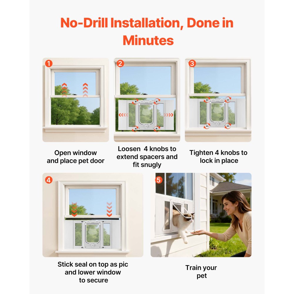 Μετρήστε πριν από την αγορά: Μετρήστε το κατοικίδιό σας και το πλαίσιο του παραθύρου πριν από την αγορά. Αυτή η πόρτα για γάτες περιλαμβάνει ρυθμιζόμενο μήκος 5 ιντσών για να εξασφαλίσει άνετη εφαρμογή για τη γάτα σας και σωστή συμβατότητα με τα παράθυρα. Σύστημα κλειδώματος 4 κατευθύνσεων: Εναλλαγή μεταξύ λειτουργίας μόνο εισόδου, μόνο εξόδου, διπλής πρόσβασης ή πλήρους κλειδώματος. Αυτή η πόρτα γατιών με παράθυρο αλουμινίου προσφέρει στη γάτα σας ευέλικτη κίνηση, ενώ παράλληλα βοηθά στη διατήρηση ενός ήρεμου περιβάλλοντος στο σπίτι. Ομαλό αυτόματο κλείσιμο και στεγανή σφράγιση: Το μαγνητικό πτερύγιο συνδυάζεται με μια άκρη με επένδυση βουρτσίσματος για ομαλό, αθόρυβο αυτόματο κλείσιμο και ασφαλή σφράγιση. Η πόρτα παραθύρου για κατοικίδια βοηθά να διατηρείται ο εσωτερικός σας χώρος ζεστός και καθαρός καθώς η γάτα σας κινείται. Εγκατάσταση χωρίς εργαλεία: Δεν χρειάζεται τρύπημα. Απλώς τοποθετήστε την πόρτα κατοικίδιων για το παράθυρο στη ράγα του παραθύρου, σφίξτε τα πόμολα και απολαύστε μια γρήγορη, τακτοποιημένη εγκατάσταση. Πλαίσιο από κράμα αλουμινίου υψηλής ποιότητας: Κατασκευασμένο με στιβαρό πλαίσιο από κράμα αλουμινίου και ένα διαφανές, ανθεκτικό στις γρατσουνιές πτερύγιο, αυτό το παράθυρο πόρτας για γάτες αντέχει στην καθημερινή χρήση και στις περίεργες περιπέτειες της γάτας σας.