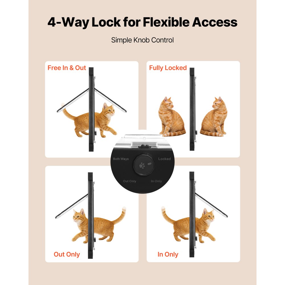 Μετρήστε πριν από την αγορά: Μετρήστε το κατοικίδιό σας και το πλαίσιο του παραθύρου πριν από την αγορά. Αυτή η πόρτα για γάτες περιλαμβάνει ρυθμιζόμενο μήκος 5 ιντσών για να εξασφαλίσει άνετη εφαρμογή για τη γάτα σας και σωστή συμβατότητα με τα παράθυρα. Σύστημα κλειδώματος 4 κατευθύνσεων: Εναλλαγή μεταξύ λειτουργίας μόνο εισόδου, μόνο εξόδου, διπλής πρόσβασης ή πλήρους κλειδώματος. Αυτή η πόρτα γατιών με παράθυρο αλουμινίου προσφέρει στη γάτα σας ευέλικτη κίνηση, ενώ παράλληλα βοηθά στη διατήρηση ενός ήρεμου περιβάλλοντος στο σπίτι. Ομαλό αυτόματο κλείσιμο και στεγανή σφράγιση: Το μαγνητικό πτερύγιο συνδυάζεται με μια άκρη με επένδυση βουρτσίσματος για ομαλό, αθόρυβο αυτόματο κλείσιμο και ασφαλή σφράγιση. Η πόρτα παραθύρου για κατοικίδια βοηθά να διατηρείται ο εσωτερικός σας χώρος ζεστός και καθαρός καθώς η γάτα σας κινείται. Εγκατάσταση χωρίς εργαλεία: Δεν χρειάζεται τρύπημα. Απλώς τοποθετήστε την πόρτα κατοικίδιων για το παράθυρο στη ράγα του παραθύρου, σφίξτε τα πόμολα και απολαύστε μια γρήγορη, τακτοποιημένη εγκατάσταση. Πλαίσιο από κράμα αλουμινίου υψηλής ποιότητας: Κατασκευασμένο με στιβαρό πλαίσιο από κράμα αλουμινίου και ένα διαφανές, ανθεκτικό στις γρατσουνιές πτερύγιο, αυτό το παράθυρο πόρτας για γάτες αντέχει στην καθημερινή χρήση και στις περίεργες περιπέτειες της γάτας σας.
