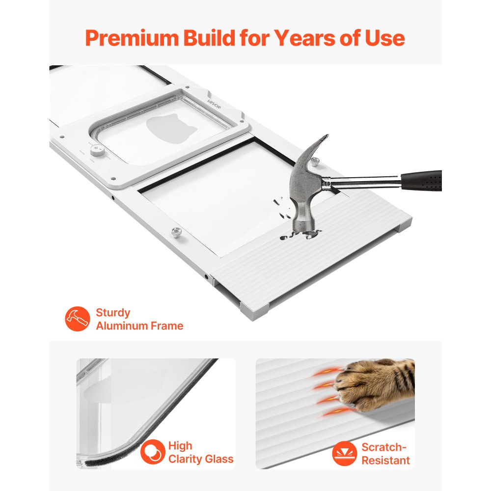 Μετρήστε πριν από την αγορά: Μετρήστε το κατοικίδιό σας και το πλαίσιο του παραθύρου πριν από την αγορά. Αυτή η πόρτα για γάτες περιλαμβάνει ρυθμιζόμενο μήκος 5 ιντσών για να εξασφαλίσει άνετη εφαρμογή για τη γάτα σας και σωστή συμβατότητα με τα παράθυρα. Σύστημα κλειδώματος 4 κατευθύνσεων: Εναλλαγή μεταξύ λειτουργίας μόνο εισόδου, μόνο εξόδου, διπλής πρόσβασης ή πλήρους κλειδώματος. Αυτή η πόρτα γατιών με παράθυρο αλουμινίου προσφέρει στη γάτα σας ευέλικτη κίνηση, ενώ παράλληλα βοηθά στη διατήρηση ενός ήρεμου περιβάλλοντος στο σπίτι. Ομαλό αυτόματο κλείσιμο και στεγανή σφράγιση: Το μαγνητικό πτερύγιο συνδυάζεται με μια άκρη με επένδυση βουρτσίσματος για ομαλό, αθόρυβο αυτόματο κλείσιμο και ασφαλή σφράγιση. Η πόρτα παραθύρου για κατοικίδια βοηθά να διατηρείται ο εσωτερικός σας χώρος ζεστός και καθαρός καθώς η γάτα σας κινείται. Εγκατάσταση χωρίς εργαλεία: Δεν χρειάζεται τρύπημα. Απλώς τοποθετήστε την πόρτα κατοικίδιων για το παράθυρο στη ράγα του παραθύρου, σφίξτε τα πόμολα και απολαύστε μια γρήγορη, τακτοποιημένη εγκατάσταση. Πλαίσιο από κράμα αλουμινίου υψηλής ποιότητας: Κατασκευασμένο με στιβαρό πλαίσιο από κράμα αλουμινίου και ένα διαφανές, ανθεκτικό στις γρατσουνιές πτερύγιο, αυτό το παράθυρο πόρτας για γάτες αντέχει στην καθημερινή χρήση και στις περίεργες περιπέτειες της γάτας σας.