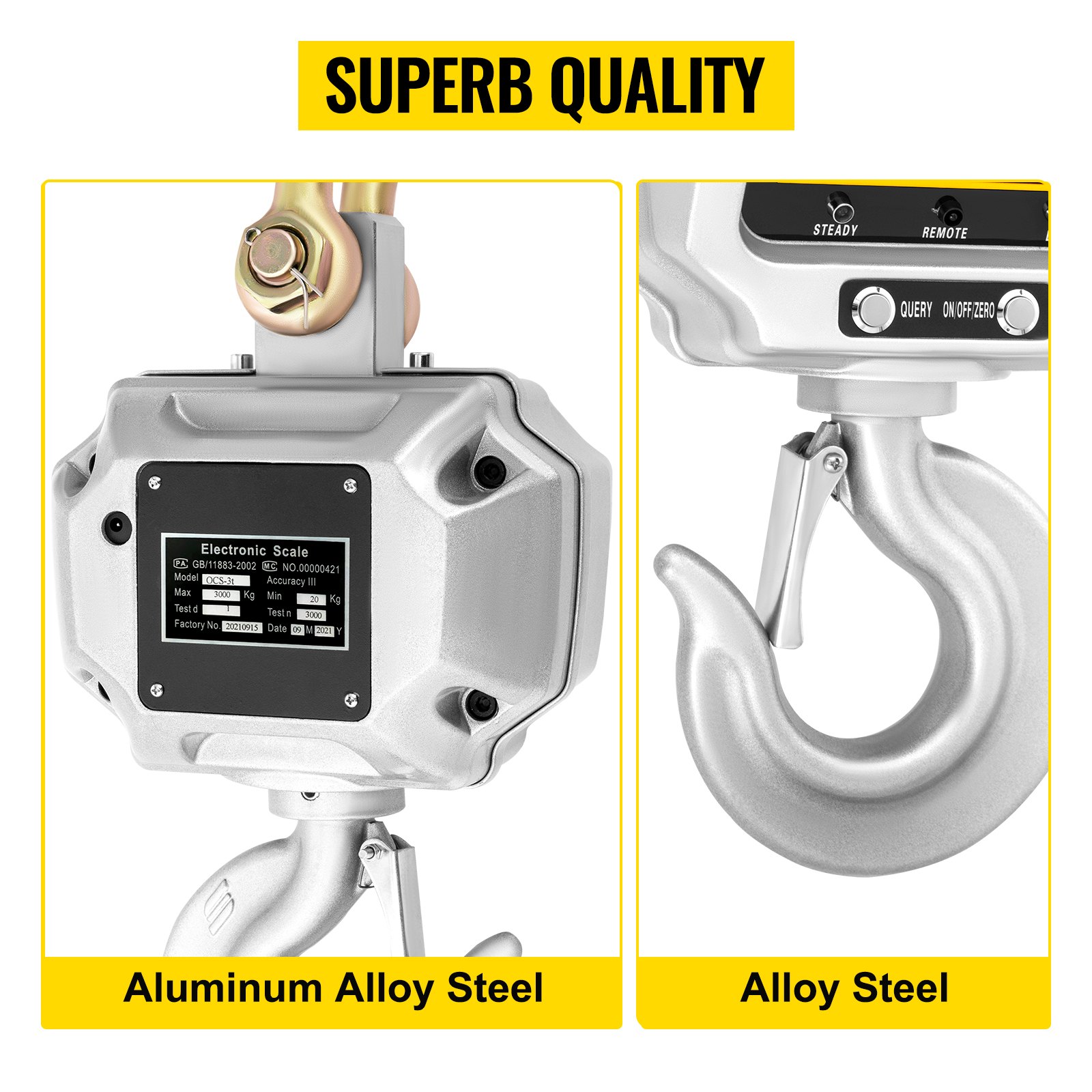 Ασυμβίβαστη ακρίβεια: Η ψηφιακή ζυγαριά ανάρτησης με μέγιστη χωρητικότητα 3000 kg/6600 LBS, είναι εξοπλισμένη με αισθητήρα ακριβείας, έχει υψηλή ακρίβεια μέτρησης και έχει επίσης τις λειτουργίες Μηδέν, απόβαρο. Κρατήστε την οθόνη.