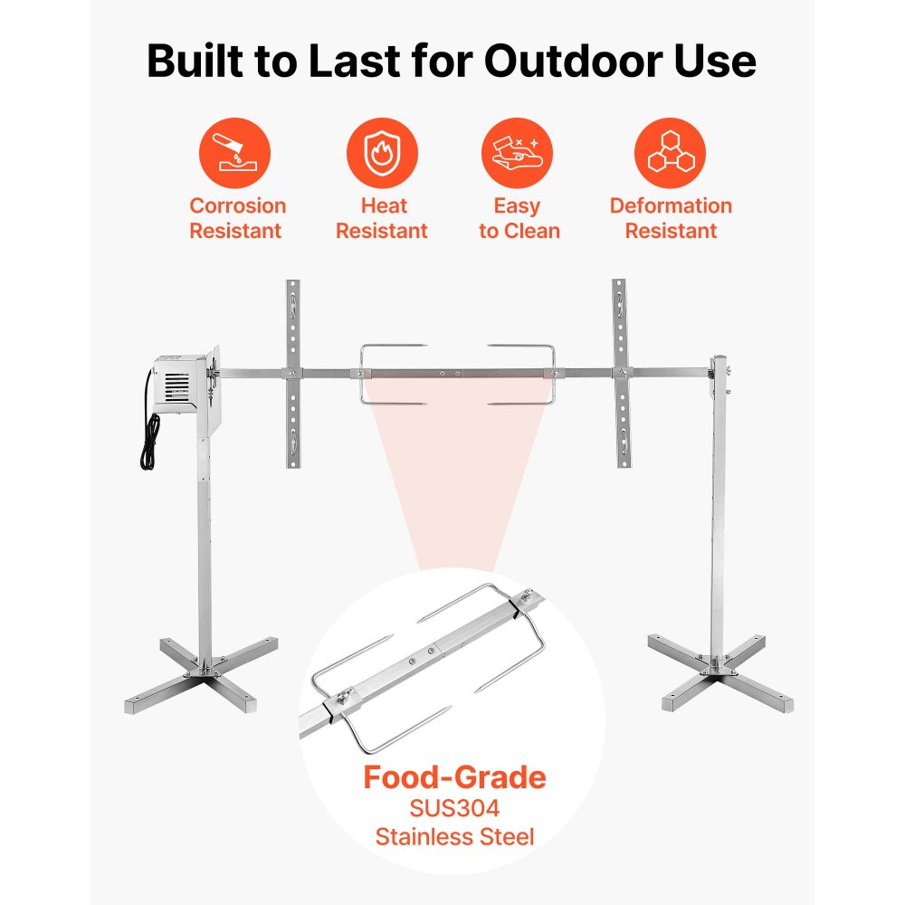 Ομαλή περιστροφή 360°: Απολαύστε ομαλή περιστροφή με αυτό το κιτ σούβλας που τροφοδοτείται από κινητήρα 38W στις 3 σ.α.λ. Τα διπλά ρουλεμάν μειώνουν την καταπόνηση του κινητήρα, ενώ ο αναβαθμισμένος ανεμιστήρας ψύξης και το προστατευτικό κάλυμμα διατηρούν τη μονάδα σε αποτελεσματική λειτουργία για ομοιόμορφα μαγειρεμένα γεύματα. Βαρέως τύπου χωρητικότητα: Σχεδιασμένη για να χειρίζεται έως και 40 κιλά, το πλαίσιο αυτής της σούβλας ψησίματος 52 ιντσών/1321 χιλιοστών χωράει χοίρους, αρνιά, γαλοπούλες και άλλα. Ιδανική για τη δημιουργία μεγάλων, ομοιόμορφα μαγειρεμένων γευμάτων που εντυπωσιάζουν την οικογένεια και τους φίλους σε οποιαδήποτε συγκέντρωση. Κατασκευή από ανοξείδωτο ατσάλι: Κατασκευασμένο από ανθεκτικό ανοξείδωτο ατσάλι, αυτό το κιτ σούβλας VEVOR εξασφαλίζει αντοχή στη σκουριά και εύκολο καθάρισμα. Εξοπλισμένο με πιρούνια SUS304 για επαφή με τρόφιμα, χειρίζεται το έντονο μαγείρεμα σε εξωτερικούς χώρους με σταθερότητα και αποτελεσματικότητα. Σύστημα ρυθμιζόμενου ύψους: Το κιτ ψησίματος μπάρμπεκιου προσφέρει 8 επίπεδα ύψους για ευέλικτο έλεγχο της απόστασης θερμότητας και της θερμοκρασίας μαγειρέματος. Το ενισχυμένο τρίποδο 45° με βάσεις στήριξης εξασφαλίζει σταθερή στήριξη ακόμα και σε γρασίδι ή μαλακές επιφάνειες για εύκολο ψήσιμο σε εξωτερικούς χώρους. Ψησταριά πολλαπλών σκηνών: Απολαύστε ένα φορητό κιτ αυτόματης ψησίματος κατάλληλο για πάρτι στην αυλή, γαμήλιες δεξιώσεις, κάμπινγκ ή εορταστικές εκδηλώσεις. Η απλή συναρμολόγηση επιτρέπει το ψήσιμο ολόκληρων χοίρων, αρνιών, γαλοπούλων και βοδινού στήθος χωρίς κόπο.