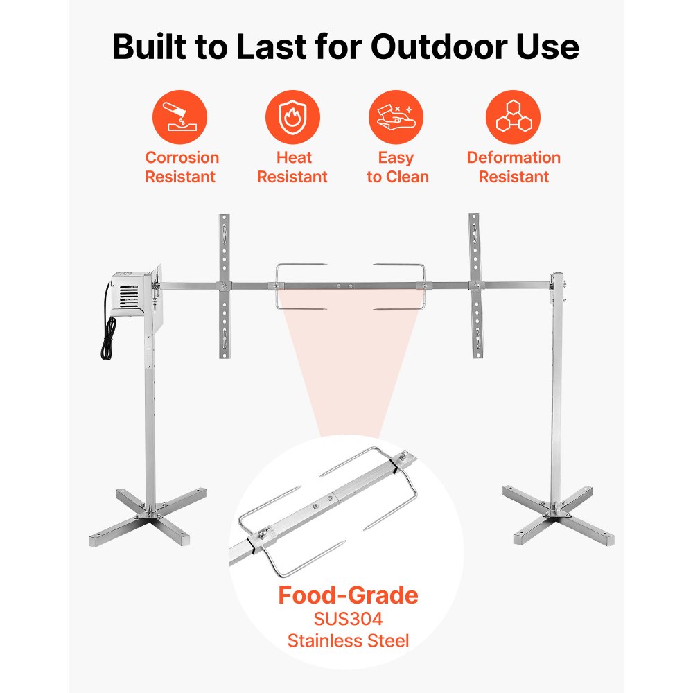 Ομαλή περιστροφή 360°: Απολαύστε ομαλή περιστροφή με αυτό το κιτ σούβλας που τροφοδοτείται από κινητήρα 38W στις 3 σ.α.λ. Τα διπλά ρουλεμάν μειώνουν την καταπόνηση του κινητήρα, ενώ ο αναβαθμισμένος ανεμιστήρας ψύξης και το προστατευτικό κάλυμμα διατηρούν τη μονάδα σε αποτελεσματική λειτουργία για ομοιόμορφα μαγειρεμένα γεύματα. Βαρέως τύπου χωρητικότητα: Σχεδιασμένη για να χειρίζεται έως και 60 κιλά, το πλαίσιο αυτής της σούβλας ψησίματος 56 ιντσών/1422,4 χιλιοστών χωράει χοίρους, αρνιά, γαλοπούλες και άλλα. Ιδανική για τη δημιουργία μεγάλων, ομοιόμορφα μαγειρεμένων γευμάτων που εντυπωσιάζουν την οικογένεια και τους φίλους σε οποιαδήποτε συγκέντρωση. Κατασκευή από ανοξείδωτο ατσάλι: Κατασκευασμένο από ανθεκτικό ανοξείδωτο ατσάλι, αυτό το κιτ σούβλας VEVOR εξασφαλίζει αντοχή στη σκουριά και εύκολο καθάρισμα. Εξοπλισμένο με πιρούνια SUS304 για επαφή με τρόφιμα, χειρίζεται το έντονο μαγείρεμα σε εξωτερικούς χώρους με σταθερότητα και αποτελεσματικότητα. Σύστημα ρυθμιζόμενου ύψους: Το κιτ ψησίματος μπάρμπεκιου προσφέρει 8 επίπεδα ύψους για ευέλικτο έλεγχο της απόστασης θερμότητας και της θερμοκρασίας μαγειρέματος. Το ενισχυμένο τρίποδο 45° με βάσεις στήριξης εξασφαλίζει σταθερή στήριξη ακόμα και σε γρασίδι ή μαλακές επιφάνειες για εύκολο ψήσιμο σε εξωτερικούς χώρους. Ψησταριά πολλαπλών σκηνών: Απολαύστε ένα φορητό κιτ αυτόματης ψησίματος κατάλληλο για πάρτι στην αυλή, γαμήλιες δεξιώσεις, κάμπινγκ ή εορταστικές εκδηλώσεις. Η απλή συναρμολόγηση επιτρέπει το ψήσιμο ολόκληρων χοίρων, αρνιών, γαλοπούλων και βοδινού στήθος χωρίς κόπο.
