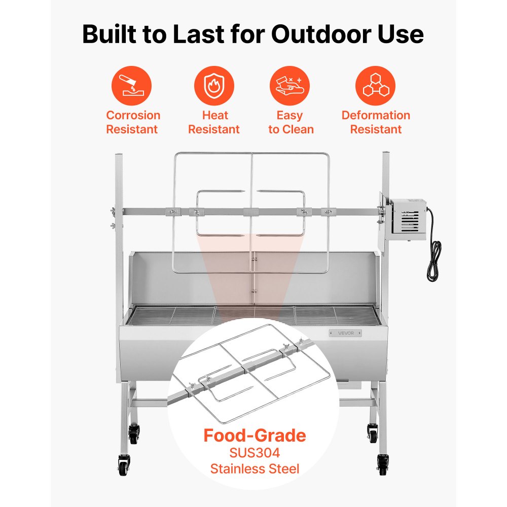 Εύκολη περιστροφή 360°: Αυτή η εξωτερική ψησταριά διαθέτει κινητήρα 38W με σχεδιασμό διπλού ρουλεμάν για ομαλή περιστροφή 360° στις 3 σ.α.λ. Ο βελτιωμένος ανεμιστήρας ψύξης και η προστατευτική προστασία από τον άνεμο βοηθούν στη διατήρηση ομοιόμορφης θερμότητας, εξασφαλίζοντας σταθερή περιστροφή και ψήσιμο χωρίς προβλήματα κάθε φορά. Σταθερή χωρητικότητα σχάρας: Με χωρητικότητα 60 κιλών, αυτή η σούβλα χειρίζεται εύκολα ολόκληρα γουρούνια (σχάρα 7,5 κιλών). Η σούβλα 37 ιντσών/940 χιλιοστών και η ευρύχωρη περιοχή μαγειρέματος 940 x 415 χιλιοστών επιτρέπουν το ψήσιμο κρεάτων και λαχανικών για ένα αξέχαστο υπαίθριο γεύμα. Ανθεκτική κατασκευή από ανοξείδωτο ατσάλι: Κατασκευασμένο από ανθεκτικό ανοξείδωτο ατσάλι, αυτό το ηλεκτρικό κιτ σούβλας αποφεύγει τη διάβρωση και καθαρίζεται εύκολα. Τα πιρούνια SUS304 και η σχάρα SUS304 εγγυώνται ασφαλή επαφή με τα τρόφιμα, παρέχοντας ανθεκτικότητα και άνεση για όλες τις υπαίθριες περιπέτειες ψησίματος. Ευέλικτος έλεγχος ύψους: Απολαύστε ευέλικτο ψήσιμο στη σχάρα με 7 ρυθμίσεις ύψους για ακριβή έλεγχο της θερμότητας. Οι κλειδώσιμοι τροχοί σάς επιτρέπουν να μετακινείτε εύκολα τη σούβλα, ενώ τα κλιπ καρυκευμάτων και η βούρτσα που περιλαμβάνονται απλοποιούν την προετοιμασία. Τα αντιανεμικά πάνελ ενισχύουν τη σταθερότητα του μαγειρέματος. Ευέλικτη χρήση σε εξωτερικούς χώρους: Πάρτε αυτή τη σούβλα για κοτόπουλο οπουδήποτε - στην αυλή, σε γάμο, σε κάμπινγκ ή σε εορταστική εκδήλωση. Η απλή συναρμολόγηση σάς επιτρέπει να ψήνετε χοιρινό, αρνί, γαλοπούλα και στήθος χωρίς κόπο, ενώ η χειροκίνητη μανιβέλα παρέχει ομαλή περιστροφή με τα χέρια σας.