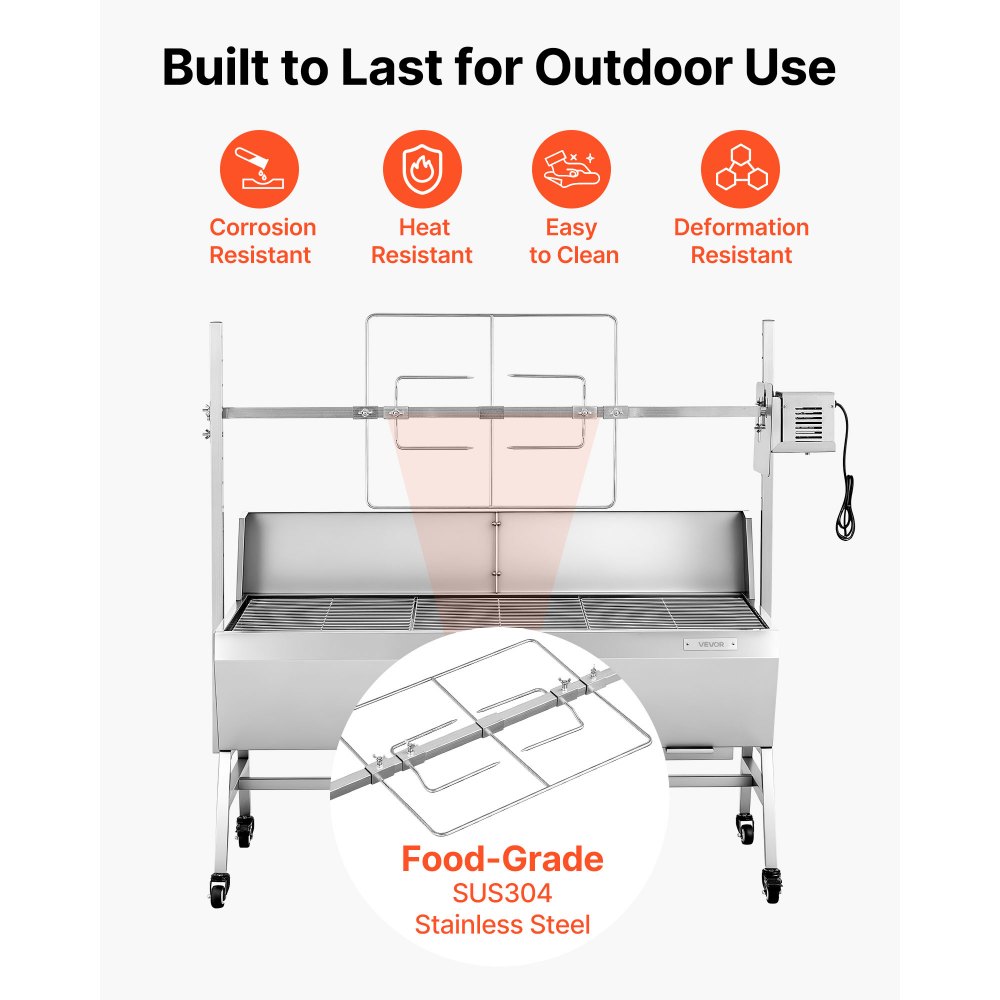 Εύκολη περιστροφή 360°: Αυτή η εξωτερική ψησταριά διαθέτει κινητήρα 38W με σχεδιασμό διπλού ρουλεμάν για ομαλή περιστροφή 360° στις 3 σ.α.λ. Ο βελτιωμένος ανεμιστήρας ψύξης και η προστατευτική προστασία από τον άνεμο βοηθούν στη διατήρηση ομοιόμορφης θερμότητας, εξασφαλίζοντας σταθερή περιστροφή και ψήσιμο χωρίς προβλήματα κάθε φορά. Σταθερή χωρητικότητα σχάρας: Με χωρητικότητα 60 κιλών, αυτή η σούβλα χειρίζεται εύκολα ολόκληρα γουρούνια (σχάρα 7,5 κιλών). Η σούβλα 1218 χιλιοστών και η ευρύχωρη περιοχή μαγειρέματος 1218 x 480 χιλιοστών επιτρέπουν το ψήσιμο κρεάτων και λαχανικών για ένα αξέχαστο γεύμα σε εξωτερικό χώρο. Ανθεκτική κατασκευή από ανοξείδωτο ατσάλι: Κατασκευασμένο από ανθεκτικό ανοξείδωτο ατσάλι, αυτό το ηλεκτρικό κιτ σούβλας αποφεύγει τη διάβρωση και καθαρίζεται εύκολα. Τα πιρούνια SUS304 και η σχάρα SUS304 εγγυώνται ασφαλή επαφή με τα τρόφιμα, παρέχοντας ανθεκτικότητα και άνεση για όλες τις υπαίθριες περιπέτειες ψησίματος. Ευέλικτος έλεγχος ύψους: Απολαύστε ευέλικτο ψήσιμο στη σχάρα με 7 ρυθμίσεις ύψους για ακριβή έλεγχο της θερμότητας. Οι κλειδώσιμοι τροχοί σάς επιτρέπουν να μετακινείτε εύκολα τη σούβλα, ενώ τα κλιπ καρυκευμάτων και η βούρτσα που περιλαμβάνονται απλοποιούν την προετοιμασία. Τα αντιανεμικά πάνελ ενισχύουν τη σταθερότητα του μαγειρέματος. Ευέλικτη χρήση σε εξωτερικούς χώρους: Πάρτε αυτή τη σούβλα για κοτόπουλο οπουδήποτε - στην αυλή, σε γάμο, σε κάμπινγκ ή σε εορταστική εκδήλωση. Η απλή συναρμολόγηση σάς επιτρέπει να ψήνετε χοιρινό, αρνί, γαλοπούλα και στήθος χωρίς κόπο, ενώ η χειροκίνητη μανιβέλα παρέχει ομαλή περιστροφή με τα χέρια σας.