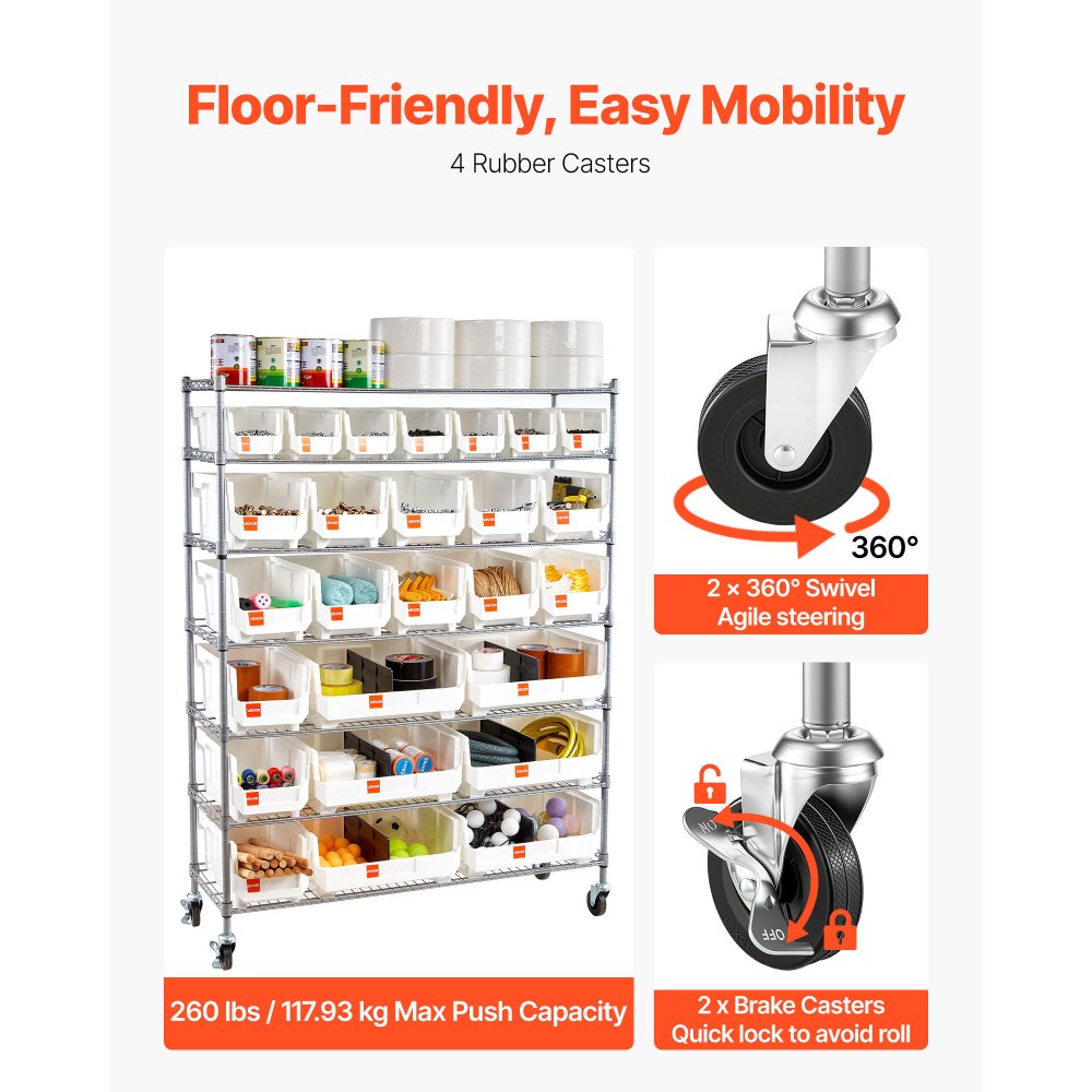 Αρθρωτή Αποθήκευση: Αυτή η 7-επίπεδη μονόπλευρη κυλιόμενη σχάρα κάδων περιλαμβάνει 7 μικρούς, 13 μεσαίους και 6 μεγάλους κάδους από πολυπροπυλένιο. Κάθε κάδος διαθέτει υποδοχή ετικέτας, ώστε να μπορείτε να τοποθετείτε ετικέτες, να ταξινομείτε και να βρίσκετε γρήγορα τα εξαρτήματα για να διατηρείτε τον χώρο σας τακτοποιημένο. Ισχυρό φορτίο: Η σχάρα αποθήκευσης κάδων υποστηρίζει στατικό φορτίο έως και 800 λίβρες και 115 λίβρες ανά επίπεδο. Τέσσερα πόδια ισοπέδωσης μειώνουν την ταλάντωση και τη διατηρούν σταθερή σε ανώμαλα δάπεδα, έτσι ώστε η εγκατάστασή σας να παραμένει ασφαλής. Ρυθμιζόμενα ράφια: Οι γρήγορες βάσεις στήριξης της μονάδας αποθήκευσης κάδου γκαράζ σάς επιτρέπουν να αλλάζετε το ύψος του ραφιού σε δευτερόλεπτα για να ταιριάζει σε διαφορετικά μεγέθη κάδων. Μεγάλα εργαλεία και μικροσκοπικά εξαρτήματα έχουν την ιδανική θέση για πιο έξυπνη αποθήκευση. Εύκολη κινητικότητα: Τέσσερις ροδάκια 360° γλιστρούν ομαλά. Δύο κλειδώνουν για στάθμευση. Ωθήστε φορτίο έως και 100 κιλά. Οι ελαστικοί τροχοί του οργανωτή κάδου γκαράζ ασφαλίζουν τα δάπεδα, απορροφούν τους κραδασμούς και βοηθούν στην ησυχία κατά τη μετακίνησή σας. Ανθεκτική κατασκευή: Ο ανθεκτικός χάλυβας Q195 με φινίρισμα ηλεκτροστατικής βαφής είναι ανθεκτικός στη διάβρωση. Οι κάδοι από πολυπροπυλένιο πάχους 3 mm είναι ανθεκτικοί σε κρούσεις και χημικά για να διατηρούν τον εξοπλισμό σας προστατευμένο.
