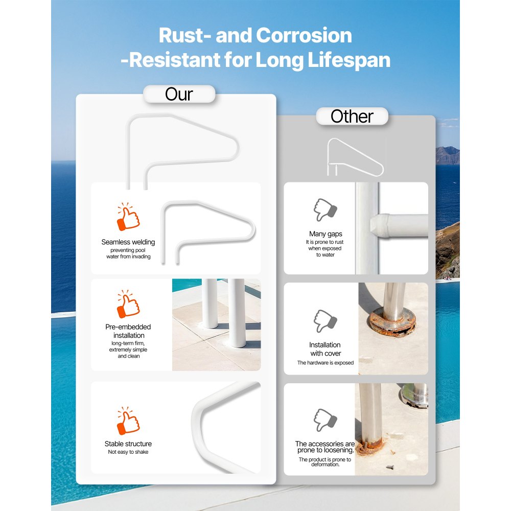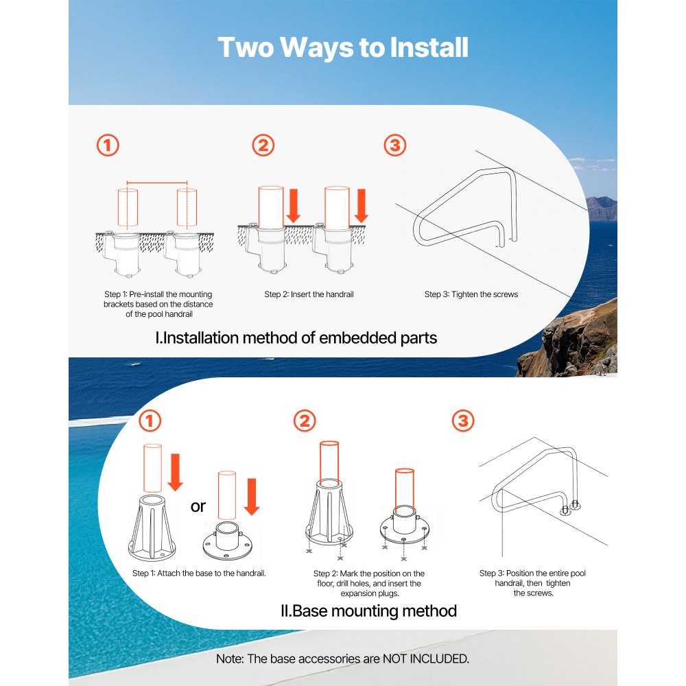 Βαρύ φορτίο 100 κιλών: Το κιγκλίδωμα πισίνας μας εξασφαλίζει ασφαλή είσοδο και έξοδο από την πισίνα σας. Είτε τραβώντας προς τα πάνω, είτε υποστηρίζοντας από το πλάι, είτε πιέζοντας προς τα κάτω κάθετα, το κιγκλίδωμα πισίνας κατανέμει το βάρος ομοιόμορφα, αντιστεκόμενο στο σπάσιμο ή την παραμόρφωση. Κατάλληλο για πισίνες με αλμυρό νερό και χλώριο: Το ρυθμιζόμενο κιγκλίδωμα πισίνας έχει επιφάνεια με επικάλυψη πολυμερούς που είναι ανθεκτική στη διάβρωση σε πισίνες με αλάτι ή χλώριο. Ο πυρήνας από ανοξείδωτο ατσάλι παρέχει ισχυρή στήριξη και είναι ανθεκτικός στην παραμόρφωση. Ξεπλύνετε με γλυκό νερό μετά τη χρήση. Μακροχρόνια αντοχή: Η απρόσκοπτη συγκόλληση ελαχιστοποιεί τα κενά που θα μπορούσαν να επιτρέψουν τη διείσδυση νερού, αποφεύγοντας τη σκουριά και τη χαλάρωση των αξεσουάρ. Η εσοχή κρύβει τα εξαρτήματα, ενισχύοντας τόσο τη μακροζωία όσο και την αισθητική. Επιλογές διπλής εγκατάστασης: Υποστηρίζει εγκατάσταση σε εσοχή ή βάση. Επιλέξτε την καλύτερη μέθοδο για την εγκατάσταση της πισίνας σας. Σημείωση: Τα αξεσουάρ βάσης δεν περιλαμβάνονται. Παρέχεται μόνο η ράγα πισίνας. Ευέλικτη τοποθέτηση: Μπορεί να εγκατασταθεί σε επιφάνειες από σκυρόδεμα, ξύλο ή τούβλα. Ιδανικό για κάγκελα πισίνας σε πισίνες, πισίνες με κεκλιμένη είσοδο, κέντρα σπα και υδάτινα πάρκα. Ιδανικό για την υποβοήθηση ηλικιωμένων και ατόμων με αναπηρία κατά την είσοδο και έξοδο από την πισίνα.
