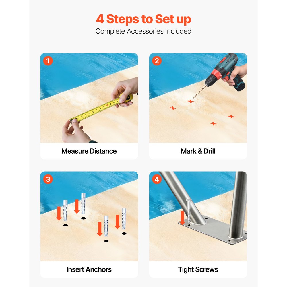 Βαρύ φορτίο 100 κιλών: Το κιγκλίδωμα πισίνας μας εξασφαλίζει ασφαλή είσοδο και έξοδο από την πισίνα σας. Είτε τραβώντας προς τα πάνω, είτε υποστηρίζοντας από το πλάι, είτε πιέζοντας προς τα κάτω κάθετα, το κιγκλίδωμα πισίνας κατανέμει το βάρος ομοιόμορφα, αντιστεκόμενο στο σπάσιμο ή την παραμόρφωση. Κατασκευή από ανοξείδωτο ατσάλι 304: Κατασκευασμένη από υψηλής ποιότητας ανοξείδωτο ατσάλι, αυτή η ρυθμιζόμενη κουπαστή πισίνας είναι ανθεκτική στη σκουριά και τη διάβρωση. Περιλαμβάνει πανί καθαρισμού. Αποφύγετε τις πισίνες με αλάτι/χλώριο, ξεπλύνετε με γλυκό νερό και σκουπίστε για να παρατείνετε τη διάρκεια ζωής της. Σχεδιασμός φιλικός προς το καλοκαίρι: Εξοπλισμένο με αποσπώμενο μανίκι για απαλό και άνετο κράτημα, αποφεύγοντας τα ζεστά χέρια το καλοκαίρι και τα κρύα τον χειμώνα. Η γρήγορη σύνδεση/αποσύνδεση με το κούμπωμα με γάντζο και θηλιά διευκολύνει τη χρήση. Πλήρη αξεσουάρ: Αυτή η ρυθμιζόμενη κουπαστή πισίνας διαθέτει βίδες, κλειδί και τρυπάνι. Χρησιμοποιήστε το δικό σας ηλεκτρικό τρυπάνι για την εγκατάσταση, δεν απαιτούνται επιπλέον αξεσουάρ. Ευέλικτη τοποθέτηση: Μπορεί να εγκατασταθεί σε επιφάνειες από σκυρόδεμα, ξύλο ή τούβλα. Ιδανικό για κάγκελα πισίνας σε πισίνες, πισίνες με κεκλιμένη είσοδο, κέντρα σπα και υδάτινα πάρκα. Ιδανικό για την υποβοήθηση ηλικιωμένων και ατόμων με αναπηρία κατά την είσοδο και έξοδο από την πισίνα.