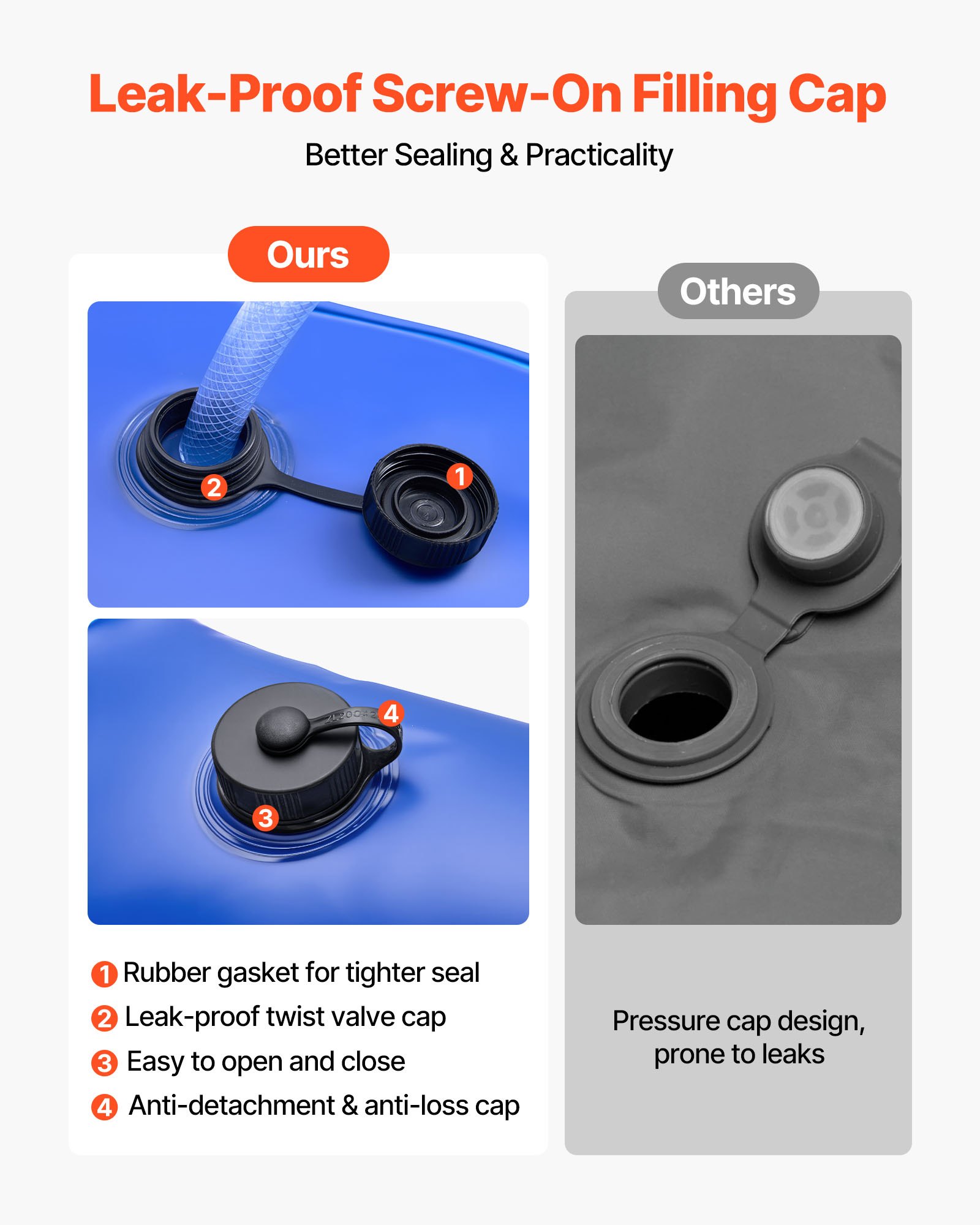 Στεγανό περιστρεφόμενο καπάκι: Κάθε εσωτερική σακούλα νερού για κάλυμμα πισίνας διαθέτει ένα εύκολα περιστρεφόμενο καπάκι με ενσωματωμένο ελαστικό παρέμβυσμα για στεγανή σφράγιση. Το αντιολισθητικό νήμα διατηρεί το καπάκι στη θέση του, ενώ ο αναβαθμισμένος σχεδιασμός ξεπερνά τα παραδοσιακά καπάκια με κούμπωμα τόσο σε άνεση όσο και σε ισχύ στεγανοποίησης. Συμβουλή: Πριν το γέμισμα, σύρετε τον δακτύλιο συγκράτησης στο κάτω μέρος του σπειροειδούς μοτίβου για ασφαλή σφράγιση.