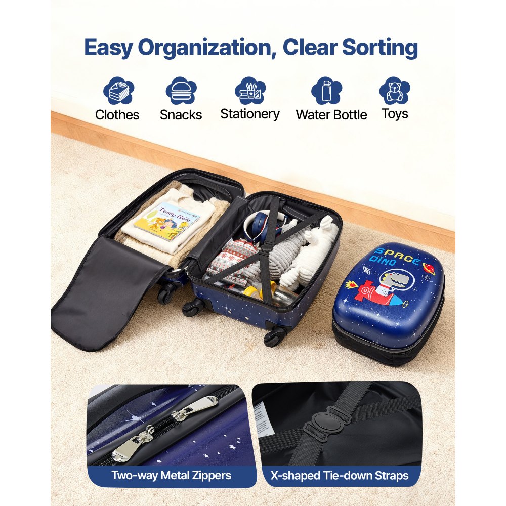 Σετ 2 τεμαχίων, εγκεκριμένο από αεροπορικές εταιρείες: Αυτή η βαλίτσα για νήπια 18 ιντσών και τα αντίστοιχα αξεσουάρ πληρούν τα πρότυπα καμπίνας αεροπορικών εταιρειών, ιδανικά για ταξίδια μεμονωμένα. Περιλαμβάνει επίσης ένα σακίδιο πλάτης με σκληρό κέλυφος. Άνετη αποθήκευση: Ομαλό φερμουάρ διπλής κατεύθυνσης και ευρύχωρο εσωτερικό για εύκολη οργάνωση. Ξεχωριστά διαμερίσματα στην παιδική βαλίτσα για ρούχα, σνακ και σχολικά είδη. Τροχοί ακριβείας: Οι περιστρεφόμενοι τροχοί 360° της παιδικής βαλίτσας παρέχουν ομαλή και αβίαστη κίνηση. Το παιδί σας μπορεί να κυλήσει τη βαλίτσα με ευκολία, κάνοντας το ταξίδι διασκεδαστικό και χωρίς προβλήματα. Ρυθμιζόμενη τηλεσκοπική λαβή: Η ρυθμιζόμενη λαβή της παιδικής βαλίτσας με ρόδες μεγαλώνει μαζί με το παιδί σας, εξασφαλίζοντας άνεση και ευκολία χρήσης σε οποιοδήποτε ύψος, κατάλληλη για παιδιά όλων των ηλικιών. Ελαφρύ και ανθεκτικό: Κατασκευασμένο από ανθεκτικό ABS, PC και πολυεστέρα, αυτό το σετ παιδικών αποσκευών είναι ελαφρύ και ανθεκτικό. Διασκεδαστικά σχέδια όπως μέλισσες, φορτηγάκια και μονόκεροι προσθέτουν ενθουσιασμό σε κάθε ταξίδι.