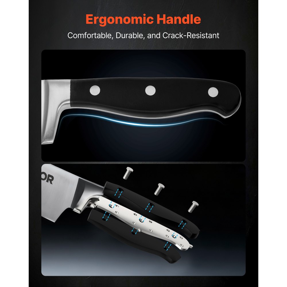 Σετ μαχαιριών κουζίνας 15 τεμαχίων: Αυτό το σετ μαχαιριών κουζίνας 15 τεμαχίων περιλαμβάνει ένα μαχαίρι σεφ 8 ιντσών, ένα μαχαίρι κοπής 8 ιντσών, ένα μαχαίρι ψωμιού 8 ιντσών, ένα μαχαίρι santoku 7 ιντσών, ένα μαχαίρι γενικής χρήσης 5 ιντσών, έξι μαχαίρια για μπριζόλες 4,5 ιντσών, ένα μαχαίρι ξεφλουδίσματος 3,5 ιντσών, μια ράβδο ακονίσματος 8 ιντσών, ψαλίδι κουζίνας και ένα ξύλινο μπλοκ. Ένα σετ χειρίζεται καθημερινές εργασίες όπως κόψιμο σε φέτες, ψιλοκομμένο και ξεφλουδισμένο κρέας. Ο μοντέρνος σχεδιασμός του το καθιστά ιδανικό δώρο για γιορτές και γιορτές. Εξαιρετική Ευκρίνεια: Κάθε λεπίδα είναι ακονισμένη με λέιζερ με λεπτή λεπίδα για λεπτότερο, πιο κοφτερό φινίρισμα που μειώνει την αντίσταση. Μπορείτε εύκολα και με ακρίβεια να χειρίζεστε υλικά με αυτό το σετ μαχαιριών, εξασφαλίζοντας ομαλές και ακριβείς κοπές κάθε φορά. Ανθεκτικό και ανθεκτικό στη σκουριά: Κατασκευασμένο από ανοξείδωτο ατσάλι υψηλής περιεκτικότητας σε άνθρακα 7CR17MOV, αυτό το σετ μαχαιριών προσφέρει υψηλή σκληρότητα και ανθεκτικότητα, αποφεύγοντας το ξεφλούδισμα ή το ράγισμα. Οι λεπίδες έχουν υποστεί θερμική επεξεργασία και παθητικοποίηση για να περάσουν τις δοκιμές ψεκασμού αλατιού, εξασφαλίζοντας αντοχή στη σκουριά και μακροχρόνια ευκρίνεια σε υγρές κουζίνες. Εξαιρετικά άνετη λαβή: Η εργονομική λαβή εφαρμόζει με ασφάλεια στην παλάμη, παρέχοντας ισορροπημένη λαβή που μειώνει την κόπωση. Το ανθεκτικό υλικό ABS είναι ανθεκτικό στη θερμότητα, στο κρύο και στις ρωγμές, ενώ η εξαιρετική κατασκευή αποτρέπει τη χαλάρωση ή το σπάσιμο, διατηρώντας αυτό το σετ μαχαιριών από ανοξείδωτο ατσάλι αξιόπιστο. Εύκολη αποθήκευση και συντήρηση: Οι διαιρούμενες υποδοχές του μπλοκ μαχαιριών διευκολύνουν την οργάνωση, αποφεύγοντας τυχαία κοψίματα. Όλες οι λεπίδες πλένονται στο πλυντήριο πιάτων για γρήγορο καθάρισμα. Αυτό το σετ μαχαιριών κουζίνας περιλαμβάνει επίσης μια ράβδο ακονίσματος 8 ιντσών για να διατηρείτε τα μαχαίρια σας αιχμηρά και σε ετοιμότητα ανά πάσα στιγμή.