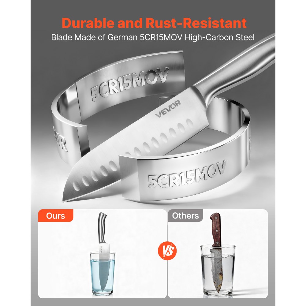 Σετ μαχαιριών κουζίνας 15 τεμαχίων: Αυτό το σετ μαχαιριών κουζίνας 15 τεμαχίων περιλαμβάνει ένα μαχαίρι σεφ 8 ιντσών, ένα μαχαίρι κοπής 8 ιντσών, ένα μαχαίρι ψωμιού 8 ιντσών, ένα μαχαίρι santoku 7 ιντσών, ένα μαχαίρι γενικής χρήσης 5 ιντσών, έξι μαχαίρια για μπριζόλες 4,5 ιντσών, ένα μαχαίρι ξεφλουδίσματος 3,5 ιντσών, μια ράβδο ακονίσματος 8 ιντσών, ψαλίδι κουζίνας και ένα ξύλινο μπλοκ. Ένα σετ καλύπτει καθημερινές εργασίες κοπής, όπως τεμαχισμό, ψιλοκομμό και ξεφλούδισμα. Η κομψή, μοντέρνα εμφάνισή του το καθιστά ιδανικό δώρο για γιορτές και γιορτές. Εξαιρετική Ευκρίνεια: Κάθε λεπίδα είναι ακονισμένη με λέιζερ με ακριβή τροχισμένη άκρη, καθιστώντας την πιο λεπτή και αιχμηρή για μείωση της αντίστασης. Μπορείτε εύκολα και με ακρίβεια να χειρίζεστε υλικά με αυτό το σετ μαχαιριών, επιτυγχάνοντας ομαλές, ακριβείς κοπές κάθε φορά. Ανθεκτικό και ανθεκτικό στη σκουριά: Κατασκευασμένο από γερμανικό ανοξείδωτο ατσάλι υψηλής περιεκτικότητας σε άνθρακα 5CR15MOV, αυτό το σετ μαχαιριών προσφέρει εξαιρετική σκληρότητα και ανθεκτικότητα, αποφεύγοντας το ξεφλούδισμα ή το ράγισμα. Οι λεπίδες υποβάλλονται σε θερμική και ψυχρή επεξεργασία με παθητικοποίηση, εξασφαλίζοντας μια επιφάνεια ανθεκτική στη σκουριά και διαρκή αιχμηρότητα ακόμη και σε υγρές κουζίνες. Εξαιρετικά άνετη λαβή: Η εργονομική λαβή εφαρμόζει ιδανικά στην παλάμη, παρέχοντας μια σταθερή, ισορροπημένη λαβή που μειώνει την κόπωση. Η ομαλή ισορροπία διευκολύνει την κοπή, ενώ η εξαιρετική κατασκευή αποτρέπει το σπάσιμο ή τη χαλάρωση της λαβής, διασφαλίζοντας ότι αυτό το σετ μαχαιριών από ανοξείδωτο ατσάλι παραμένει αξιόπιστο. Εύκολη αποθήκευση και συντήρηση: Οι διαιρούμενες υποδοχές του μπλοκ μαχαιριών διευκολύνουν την πρόσβαση και την οργάνωση, αποφεύγοντας τυχαία κοψίματα. Όλες οι λεπίδες πλένονται στο πλυντήριο πιάτων για γρήγορο καθάρισμα. Αυτό το σετ μαχαιριών κουζίνας περιλαμβάνει επίσης μια ράβδο ακονίσματος 8 ιντσών για να διατηρείτε τα μαχαίρια σας αιχμηρά και σε ετοιμότητα ανά πάσα στιγμή.