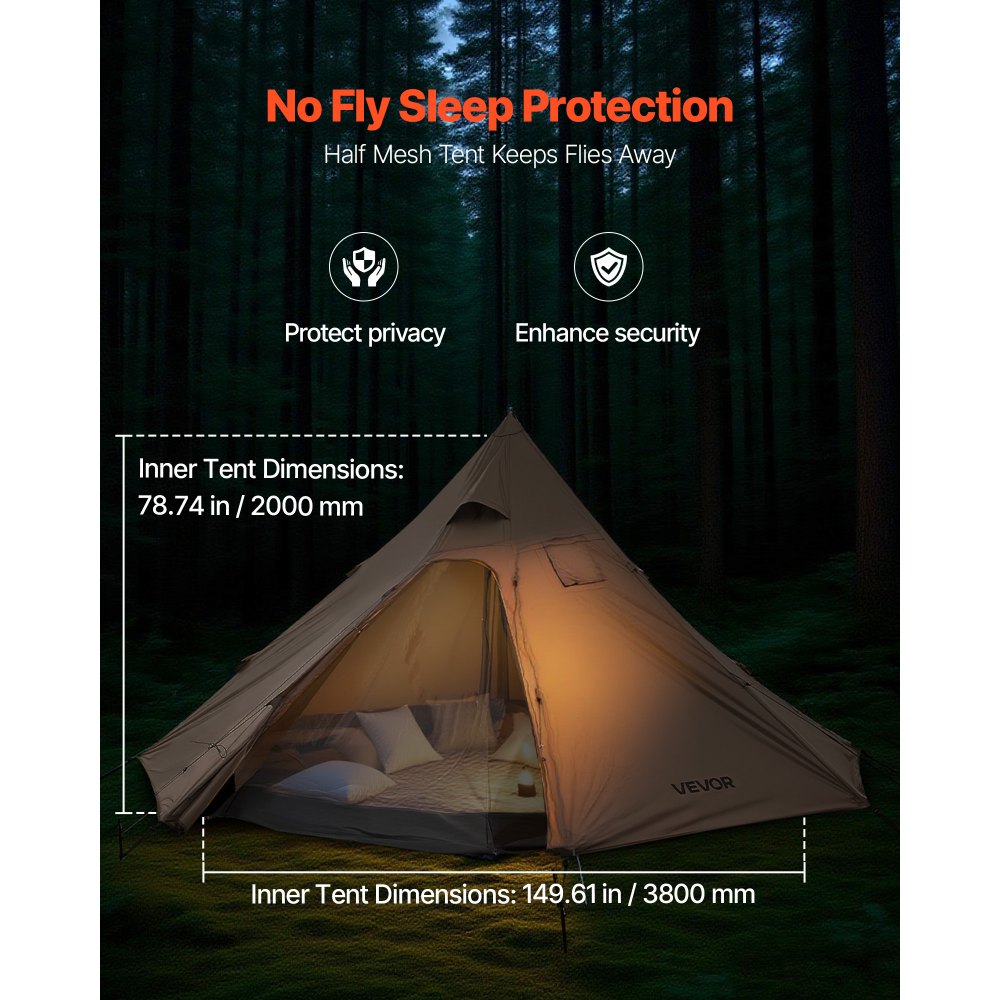 Εσωτερικό πλέγμα για προστασία: Η χειμερινή σκηνή περιλαμβάνει μια εσωτερική σκηνή από πλέγμα για να κρατά τα έντομα έξω, εξασφαλίζοντας παράλληλα ιδιωτικότητα και έναν ασφαλέστερο, πιο ξεκούραστο ύπνο. Ευρύχωρη και άνετη: Με διάμετρο 3,5 μ. (11,5 πόδια) και ύψος 2,1 μ. (6,9 πόδια), αυτή η ευρύχωρη σκηνή κάμπινγκ με υποδοχή κουζίνας χωράει 2-4 άτομα. Είναι ιδανική για μαγείρεμα, συγκεντρώσεις και χαλάρωση. Αδιάβροχο ύφασμα: Κατασκευασμένο από πολυεστέρα 70D με αδιάβροχη επίστρωση PU2500mm, ώστε να μπορείτε να κατασκηνώνετε με σιγουριά ακόμα και σε δυνατή βροχή με αυτή τη σκηνή κάμπινγκ εξωτερικού χώρου. Εξαιρετικός αερισμός: Οι διχτυωτές οπές αερισμού γύρω από τη χειμερινή σκηνή 4 εποχών και στο πάνω μέρος προάγουν τη ροή του αέρα και μειώνουν τη συμπύκνωση, καθιστώντας την άνετη όλες τις εποχές. Ευέλικτη για κάθε περιπέτεια: Η εξωτερική μας σκηνή ζεστού αέρα είναι ιδανική για ψάρεμα, κάμπινγκ, κυνήγι και πολλά άλλα. Αυτή η σκηνή ζεστού αέρα για κάμπινγκ προσφέρει ένα ζεστό, άνετο καταφύγιο σαν στο σπίτι σας, ακόμα και σε σκληρές καιρικές συνθήκες.