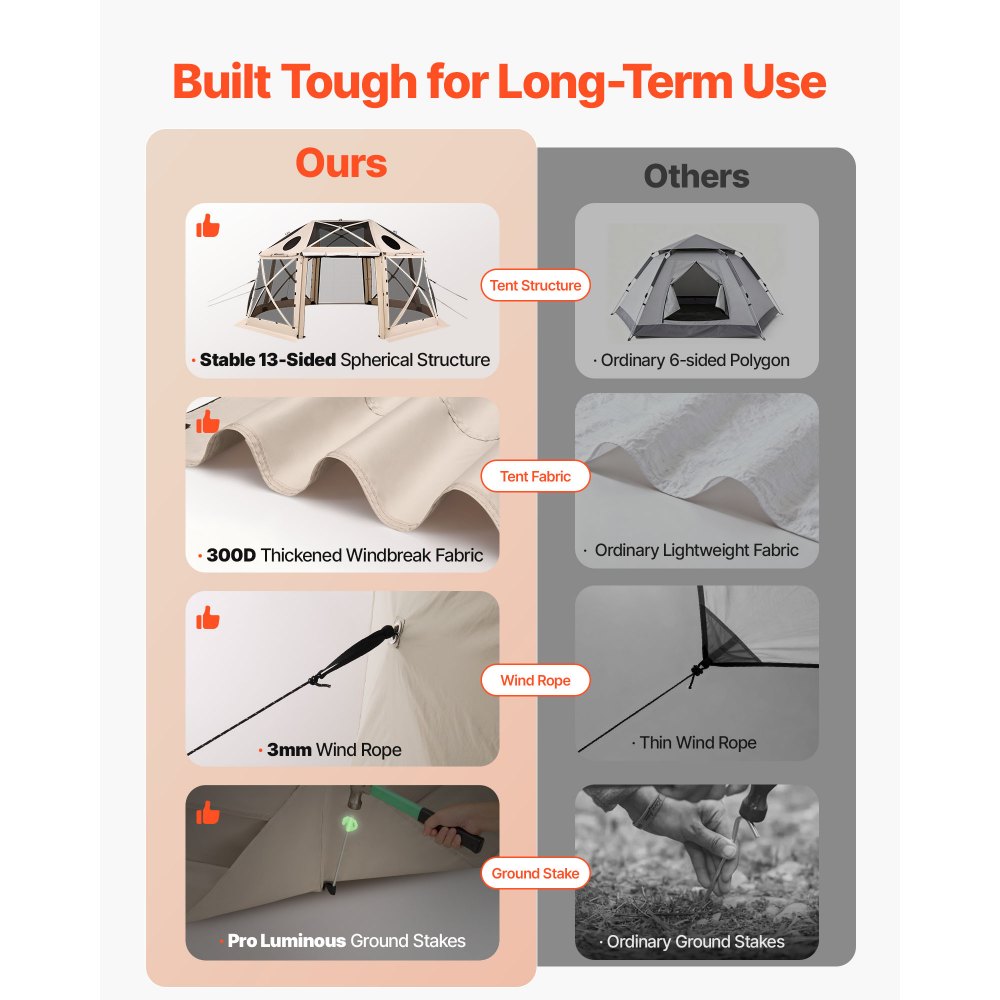 Ευρύχωρο δωμάτιο για 15 άτομα: Η σκηνή κάμπινγκ 15x15 ποδιών με καινοτόμο γεωδαιτικό σχεδιασμό χωράει άνετα 8 άτομα με έπιπλα, και μπορεί να φιλοξενήσει έως 12-15 άτομα. Το ύψος στο κέντρο 2,4 πόδια και το ύψος στο πλάι 1,5 πόδια επιτρέπουν την εύκολη μετακίνηση στο εσωτερικό. Οι πόρτες με φερμουάρ και δέσιμο εξασφαλίζουν άνετη είσοδο και έξοδο για οικογενειακές συγκεντρώσεις, πάρτι ή κάμπινγκ. Εξωτερικός χώρος διαβίωσης 3 σε 1: Η αναδιπλούμενη σκηνή από πλέγμα από κιόσκι διαθέτει μετατρέψιμα πάνελ πόρτας που λειτουργούν και ως αναβαθμισμένο σκίαστρο με ενσωματωμένους στύλους. Η αφαιρούμενη τέντα 300D Oxford προσφέρει προστασία UV50+ από το έντονο ηλιακό φως. Το ύφασμα με επίστρωση PU σας κρατά στεγνούς κατά τη διάρκεια της βροχής. Η διχτυωτή οροφή "έναστρου ουρανού" προσφέρει ανοιχτή θέα για διασκέδαση παρατήρησης των άστρων. Ανθεκτική στον άνεμο δομή 13 πλευρών: Η σκηνή μας με σκεπαστή οροφή και ενισχυμένο γεωδαιτικό σχεδιασμό αντιστέκεται στην κατάρρευση από τον άνεμο. Τα παχιά πάνελ 300D με δυνατότητα περιτύλιξης παρέχουν προστασία από τον άνεμο και ιδιωτικότητα. Περιλαμβάνει πολλαπλούς πασσάλους και σχοινιά στήριξης για ασφαλή αγκύρωση στο έδαφος. (Συμβουλή: Για την ασφάλειά σας, αποσυναρμολογήστε και αποθηκεύστε την κατά τη διάρκεια καταιγίδων ή έντονων βροχοπτώσεων.) Γρήγορη εγκατάσταση και συμπαγής αποθήκευση: Η σκηνή με στέγαστρο και σύστημα αναδιπλούμενου κεντρικού άξονα επιτρέπει τη συναρμολόγηση από ένα άτομο σε δευτερόλεπτα χωρίς εργαλεία. Διπλώνει σε τσάντα μεταφοράς 4,3 ft / 1,3 m για εύκολη μεταφορά και αποθήκευση σε SUV ή RV. Αερισμός 360°: Τα σπίτια με σήτα και τα κιόσκια διαθέτουν τοίχους και στέγη από πλέγμα που επιτρέπουν τη ροή του αέρα. Δύο αναδιπλούμενα πάνελ ανέμου με αεραγωγούς διατηρούν την κυκλοφορία του αέρα ακόμα και όταν είναι κλειστά, παρέχοντας ένα δροσερό περιβάλλον για παιδιά και ενήλικες.