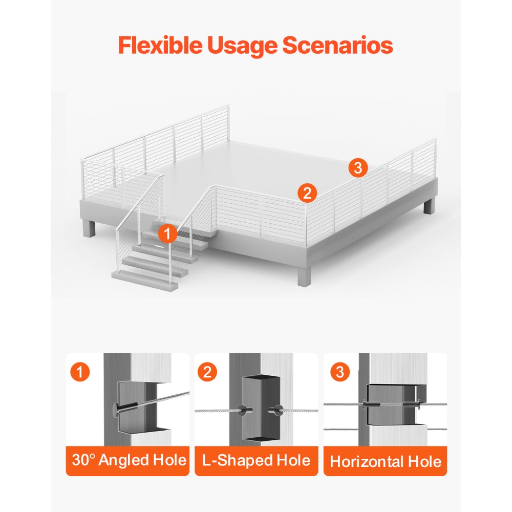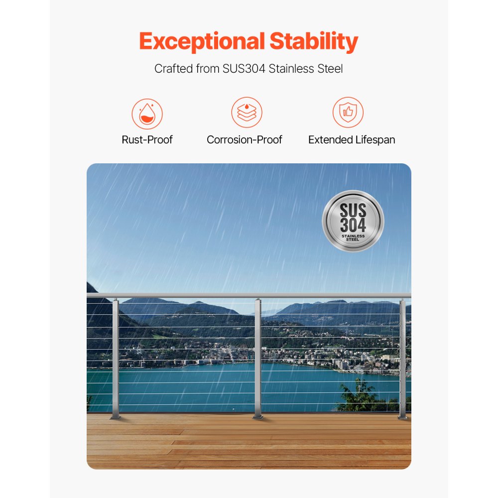 Στύλος κιγκλιδώματος οριζόντιας οπής: Αυτός ο στύλος κιγκλιδώματος καλωδίου οριζόντιας οπής διατίθεται σε ύψη 42" και 36", με οπές 0,31" και 0,41", συνολικά 10-12 οπές. Έχει σχεδιαστεί για οριζόντια προστασία κιγκλιδωμάτων εδάφους/καταστρώματος, προστατεύοντας εσάς και την οικογένειά σας. Σημείωση: Αυτό το προϊόν δεν περιλαμβάνει συρματόσχοινα. Ανθεκτικό και Στιβαρό: Ο στύλος χειρολισθήρα καλωδίων μας είναι κατασκευασμένος από ανοξείδωτο χάλυβα SUS304 υψηλής ποιότητας, προσφέροντας εξαιρετική αντοχή στη σκουριά και προστασία από τη διάβρωση για μακροχρόνια ανθεκτικότητα. Ωστόσο, δεν συνιστάται για παράκτιες εφαρμογές. Σημείωση: Εφαρμόστε αντισκωριακό λάδι στον άξονα του κιγκλιδώματος πριν από την αρχική χρήση. Συμμορφώνεται με τους κανονισμούς: Οι οριζόντιες οπές έχουν απόσταση 3" μεταξύ τους. Συνήθως, το άνοιγμα μεταξύ δύο στύλων δεν πρέπει να υπερβαίνει τα 4 πόδια για να περάσει η δοκιμή μπάλας 4". Εύκολη εγκατάσταση και DIY: Αυτός ο στύλος κιγκλιδώματος καταστρώματος περιλαμβάνει οριζόντια και καμπύλα στηρίγματα, κατάλληλα για διάφορους τύπους οπών σε στύλους κιγκλιδώματος. Είναι συμβατός με τετράγωνα και στρογγυλά κιγκλιδώματα από σωλήνες, επιτρέποντας την DIY προσαρμογή των γωνιών των κιγκλιδωμάτων. Προστασία πολλαπλών σκηνών: Ο στύλος μας για συρματόσχοινα είναι κατάλληλος τόσο για εσωτερική όσο και για εξωτερική προστασία, όπως καταστρώματα, σκάλες, βεράντες, φράχτες, αίθρια, μπαλκόνια, κήπους, οικιστικά κτίρια, εμπορικά γραφεία, ξενοδοχεία, γκαράζ και άλλα.