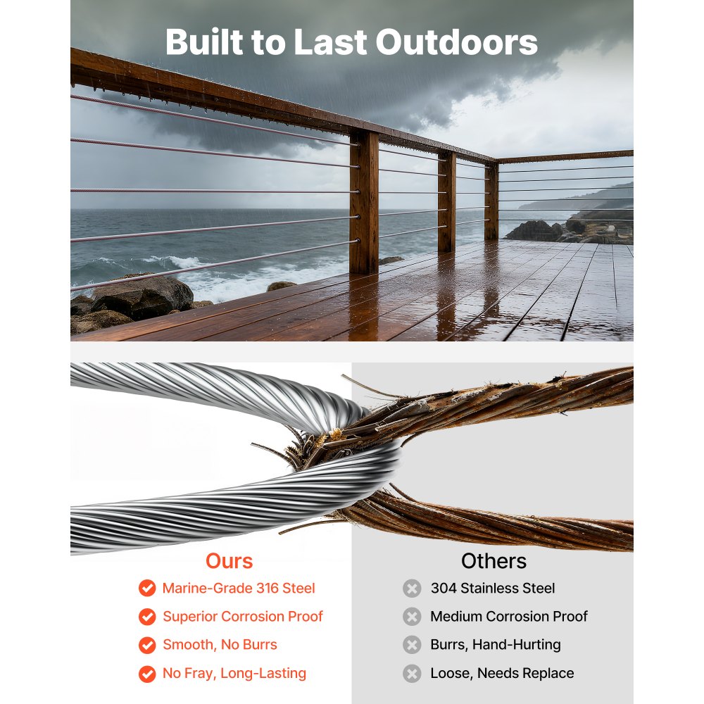 Ανοξείδωτο 316 Θαλάσσιας Ποιότητας: Αυτό το συρματόσχοινο από χάλυβα αντιστέκεται στη σκουριά σε παράκτιες ή υγρές περιοχές. Η σφιχτή τοποθέτηση 1x19 παραμένει ανθεκτική και η λεία, χωρίς γρατζουνιές επιφάνεια βοηθά στον ασφαλή χειρισμό και στην τακτοποίηση της εγκατάστασης. Διάμετρος 1/8 ίντσας & αντοχή σε θραύση 1.760 λίβρες: Αυτό το χαλύβδινο συρματόσχοινο προσφέρει σταθερή χωρητικότητα για κιγκλιδώματα, φράχτες και κρεμαστές ράγες. Διατηρείτε τις κατασκευές σταθερές για μεγάλη χρήση σε εσωτερικούς και εξωτερικούς χώρους υπό καθημερινά φορτία. Μπομπίνα μήκους 1.000 ποδιών: Αυτή η ρολό πλεγμένου σύρματος καλύπτει μεγάλα έργα χωρίς συνεχείς παραγγελίες. Ολοκληρώνετε κιγκλιδώματα σκαλοπατιών, φράχτες αυλής, φωτιστικά ή γραμμές πέργκολας από μία μόνο μπομπίνα για να εξοικονομήσετε χρόνο και ταξίδια. Εργονομικός κόφτης καλωδίων που περιλαμβάνεται: Αυτός ο κόφτης του κιτ συρματόσχοινου διαθέτει άνετες λαβές και αιχμηρές λεπίδες για καθαρές κοπές σε συρματόσχοινο 316. Απολαμβάνετε καθαρές άκρες και μειωμένη καταπόνηση των χεριών σε επαναλαμβανόμενες κοπές. Ευρεία εφαρμογή: Αυτό το μεταλλικό καλώδιο είναι κατάλληλο για κιγκλιδώματα σκαλοπατιών, φράχτες κήπου, κρεμαστά φωτιστικά, σκοινιά απλώματος, πέργκολες για κλήματα και ταΐστρες πουλιών. Αντιμετωπίζετε εργασίες σπιτιού, κήπου και DIY με ένα αξιόπιστο ρολό.