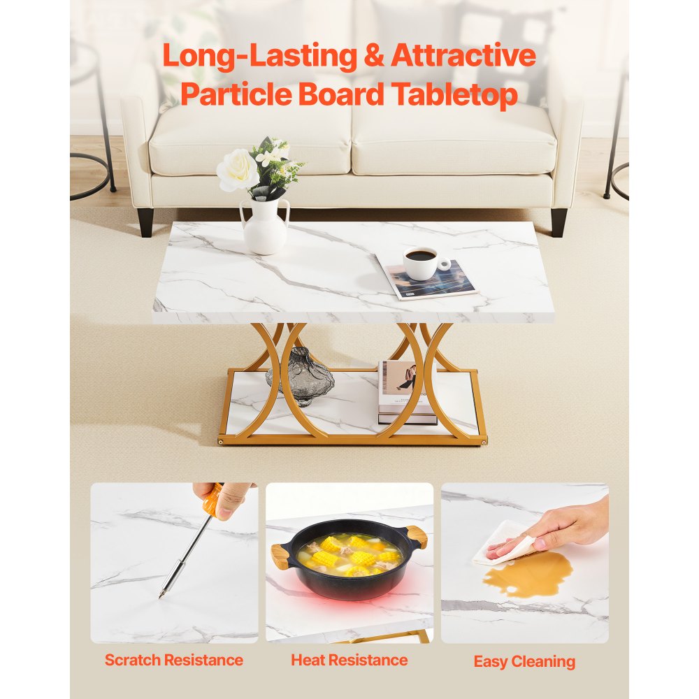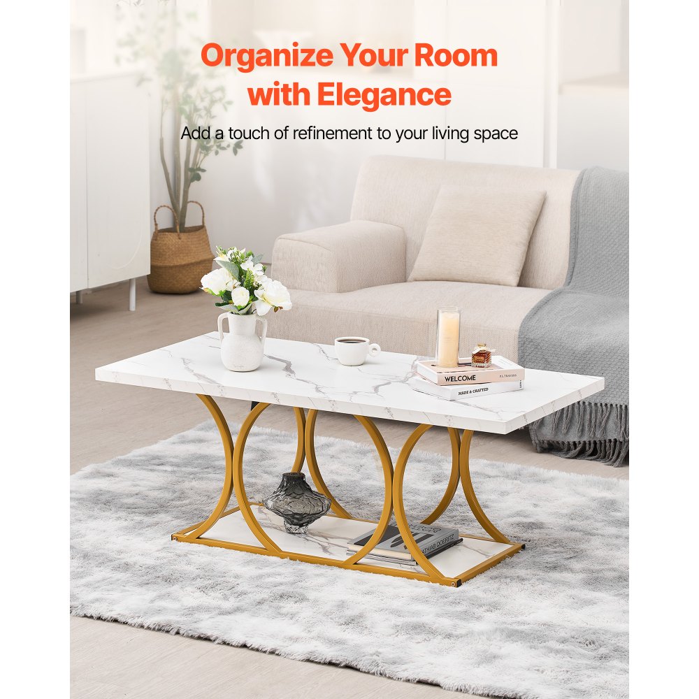 Σχεδιασμός 2 επιπέδων: Με μεγάλη επιφάνεια, το τραπεζάκι σαλονιού χωράει εύκολα βιβλία, ποτήρια νερού, φορητούς υπολογιστές και σνακ για εύκολη πρόσβαση. Προσθέτει μικρότερο χώρο αποθήκευσης στο κάτω μέρος για την αποθήκευση καθημερινών μικρών αντικειμένων, βελτιώνοντας την αποτελεσματικότητα της αποθήκευσης. Κλασικό Μοντέρνο Στυλ: Το ορθογώνιο τραπέζι μας διαθέτει λευκή μαρμάρινη επιφάνεια με επιχρυσωμένα γεωμετρικά μεταλλικά πόδια. Το χρυσό μεταλλικό σκελετό του προσθέτει ένα μοναδικό βιομηχανικό μοντέρνο στυλ, καθιστώντας το μια εξαιρετική διακόσμηση σπιτιού και ιδανικό για χαλάρωση με φίλους και οικογένεια. Σταθερή Στήριξη: Κατασκευασμένο από μεταλλικό σκελετό, το ξύλινο τραπεζάκι σαλονιού αντέχει σταθερά έως και 91 κιλά. Το ψημένο χρώμα αντέχει στη διάβρωση, τη σκουριά και την παραμόρφωση για μακροχρόνια χρήση. Τα ρυθμιζόμενα πόδια του είναι επίπεδα σε ανώμαλα δάπεδα για να διατηρείται το τραπεζάκι σαλονιού σταθερό. Εύκολη εγκατάσταση και καθαρισμός: Ακολουθήστε τις σαφείς οδηγίες για γρήγορη συναρμολόγηση. Διαθέτοντας επιφάνεια από μοριοσανίδα, το κεντρικό μας τραπέζι από ξύλο είναι αδιάβροχο και ανθεκτικό στη φθορά για μακροχρόνια χρήση. Οι λεκέδες μπορούν να σκουπιστούν εύκολα για μια φωτεινή, καθαρή επιφάνεια. Ευέλικτη χρήση: Ιδανικό για υπνοδωμάτια, δωμάτια επισκεπτών, γραφεία ή ως τραπεζάκι σαλονιού, βοηθητικό τραπεζάκι, γραφείο ή τραπέζι βεράντας, το μεταλλικό τραπεζάκι σαλονιού μας συμπληρώνει κάθε στυλ διακόσμησης. Σημείωση: Τα χρώματα ενδέχεται να διαφέρουν ελαφρώς από τις εικόνες λόγω του φωτισμού και των ρυθμίσεων της οθόνης.